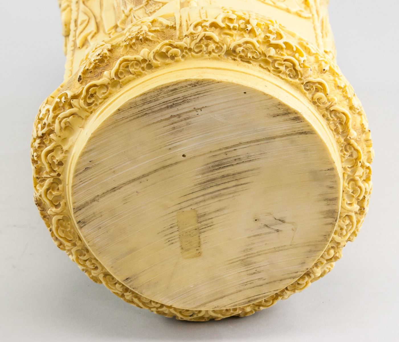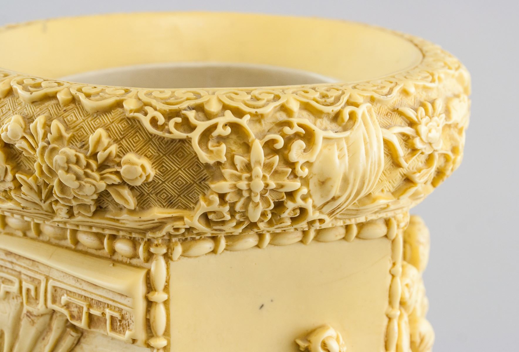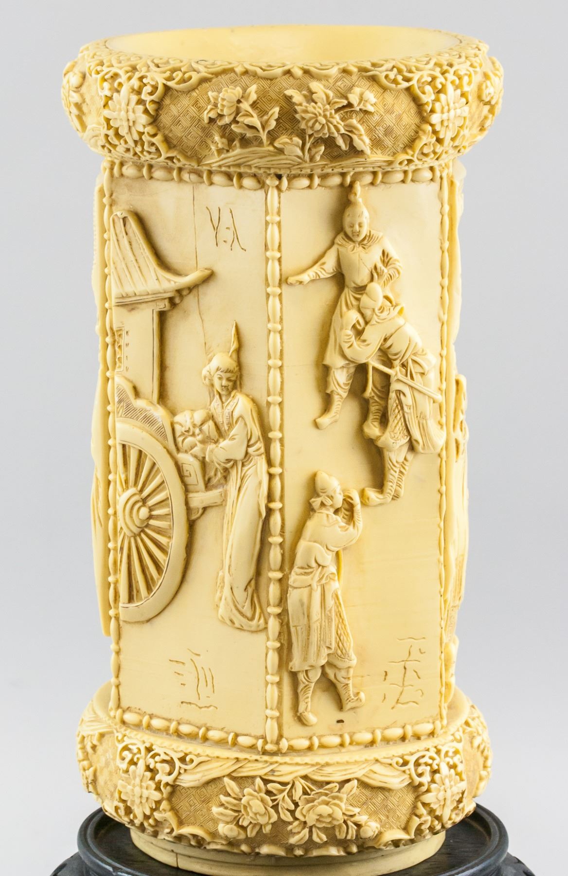 Chinese hexagonal stone/resin brushpot. Carved with figures. With wood stand. 36 x 20 cm, Stand: 15 x 26 cm, Total: 7 kg