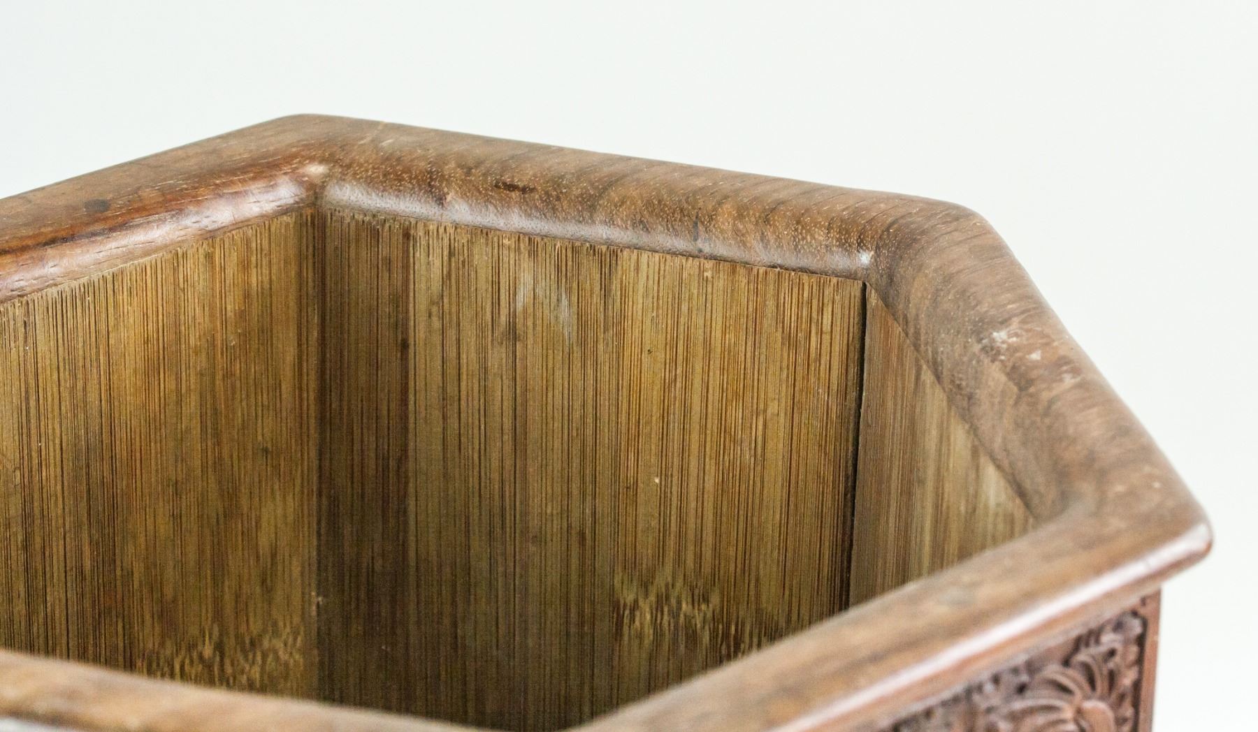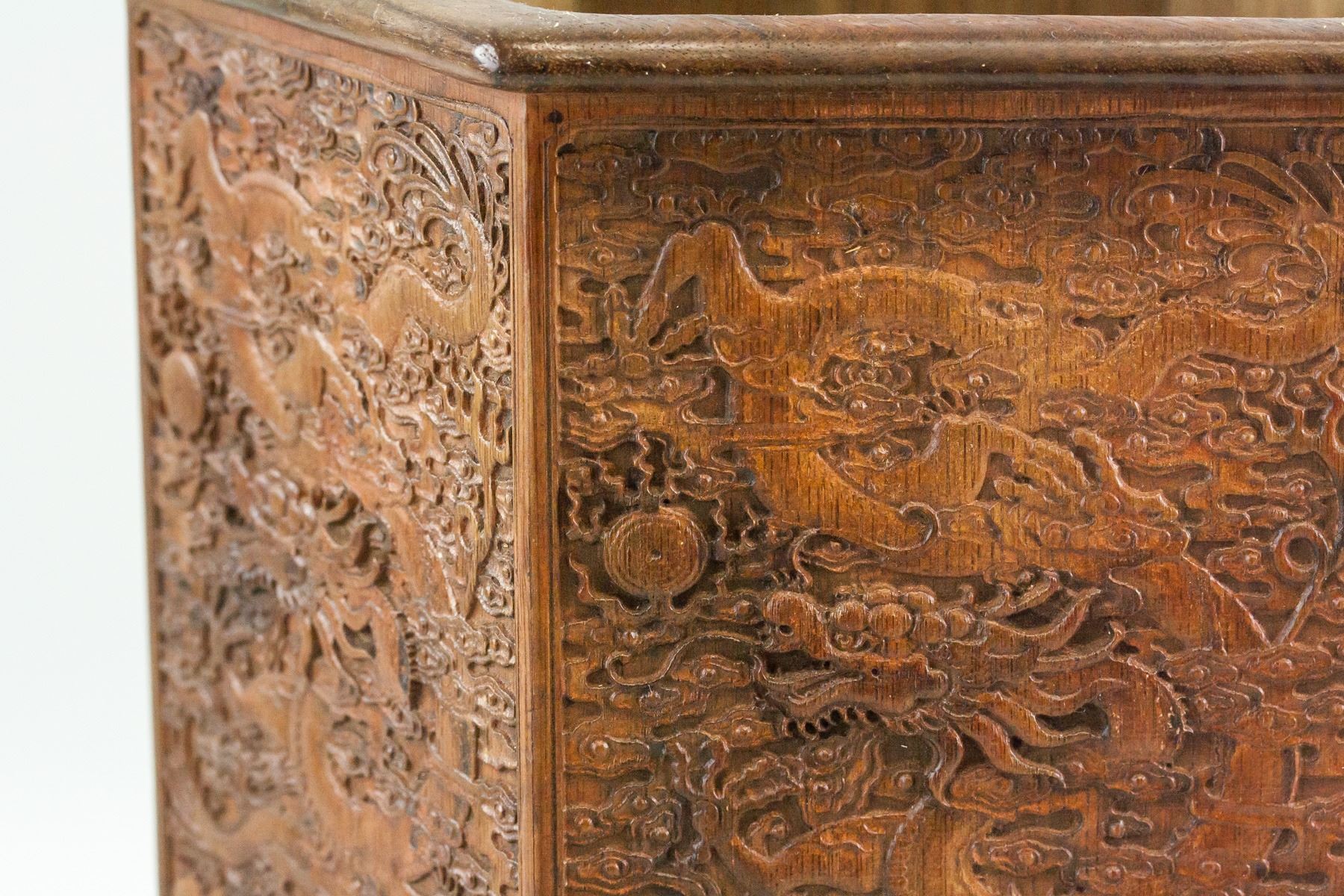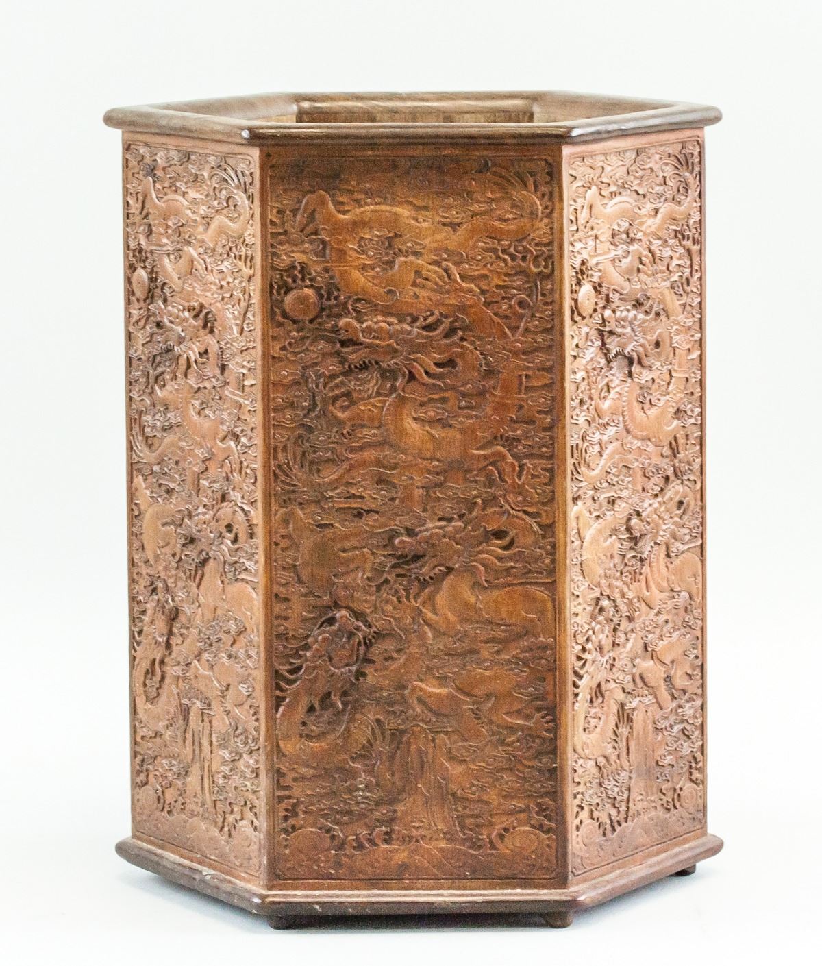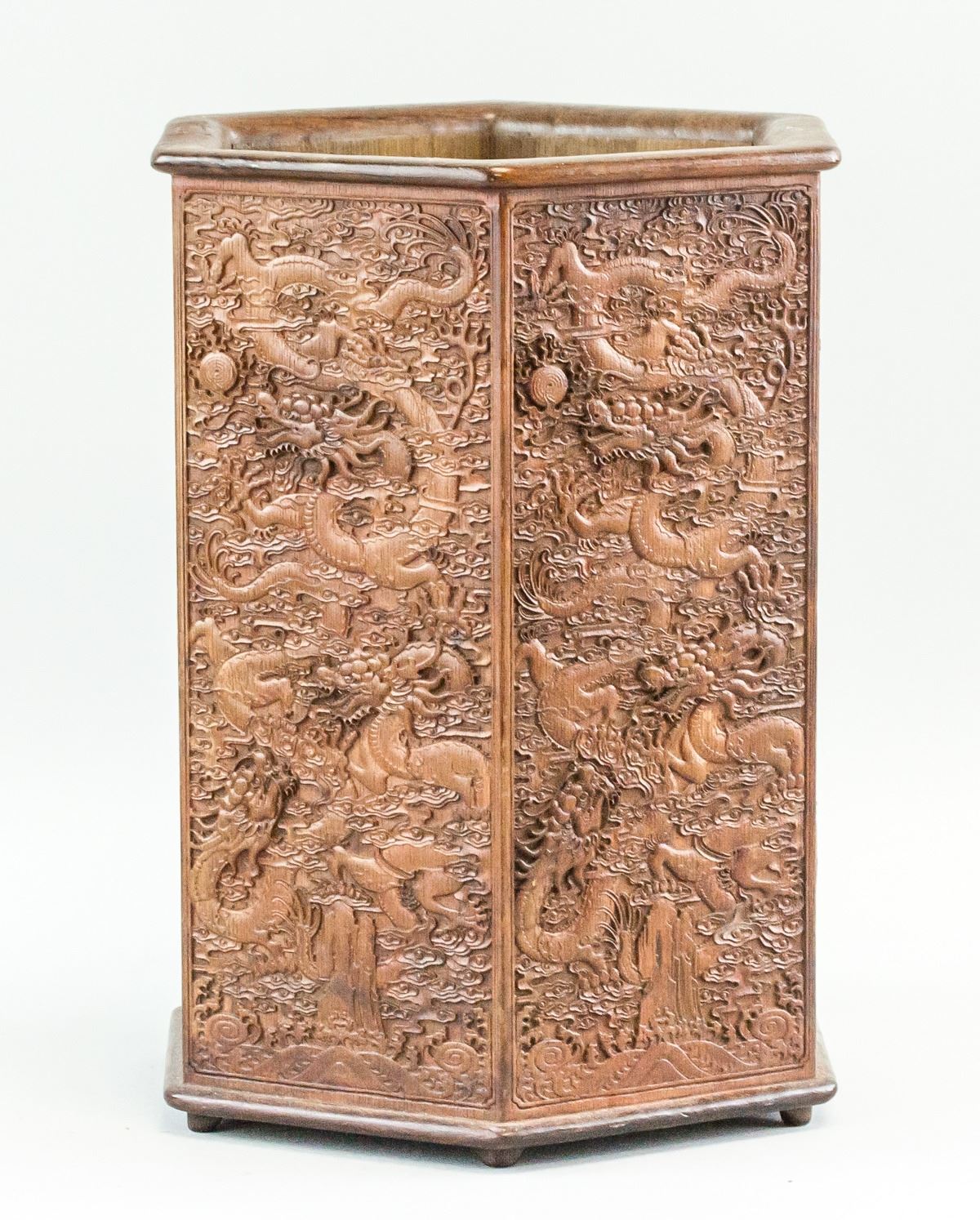 Chinese relief carved , 'bi-tong' brush pot. Featuring relief carvings of dragon chasing flaming pearl on each panel of hexagonal sided brush pot. Supported on six feet. 31 x 23 cm, 2116 grams. Provenance: Toronto estate