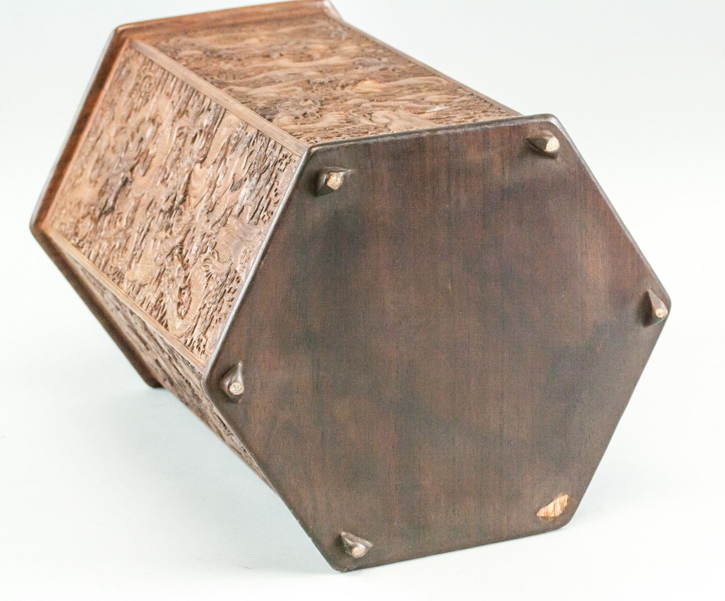 Chinese relief carved , 'bi-tong' brush pot. Featuring relief carvings of dragon chasing flaming pearl on each panel of hexagonal sided brush pot. Supported on six feet. 31 x 23 cm, 2116 grams. Provenance: Toronto estate