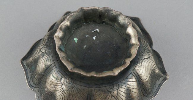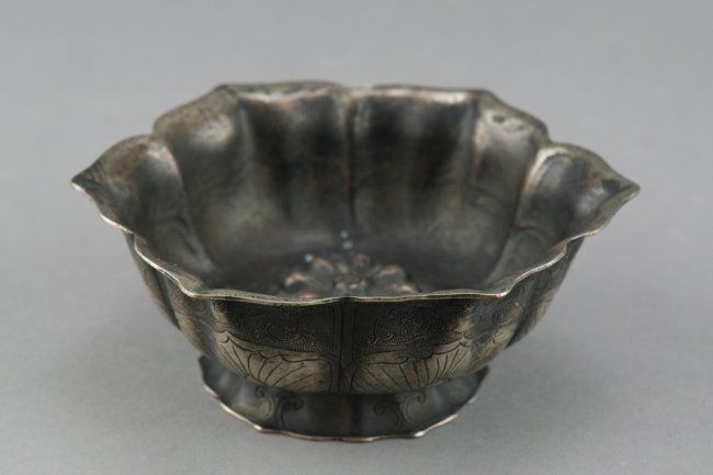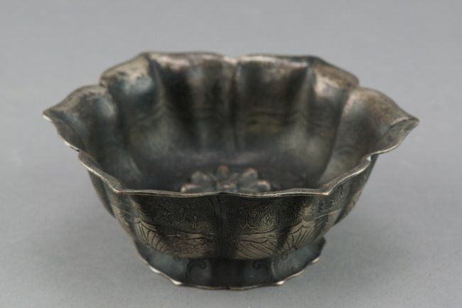 Chinese silver bowl; hexagonal form with flared rim and lobed form; supported on short foot rim; H: 5 cm, D: 15 cm, 208 grams