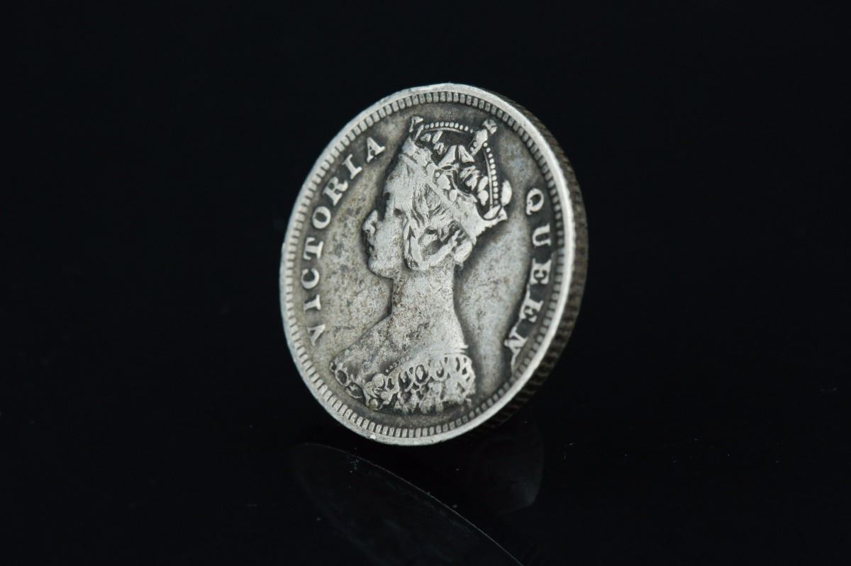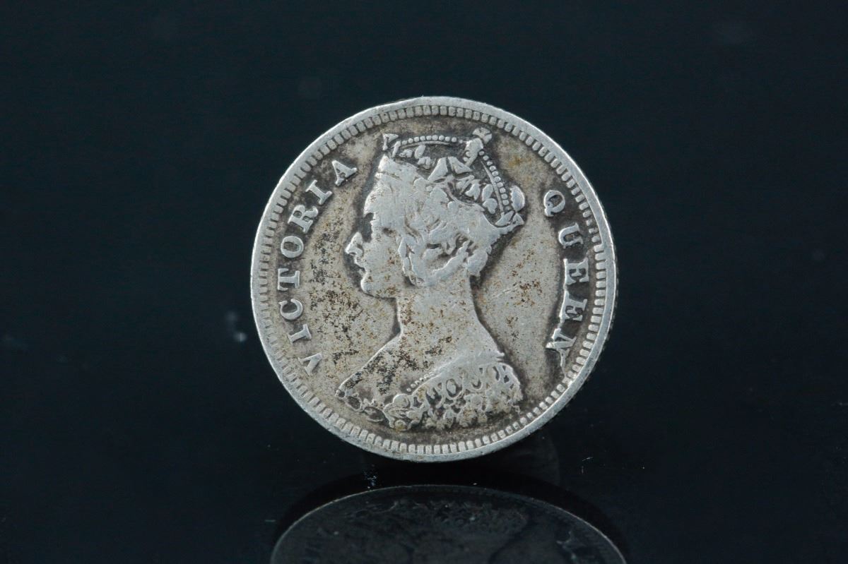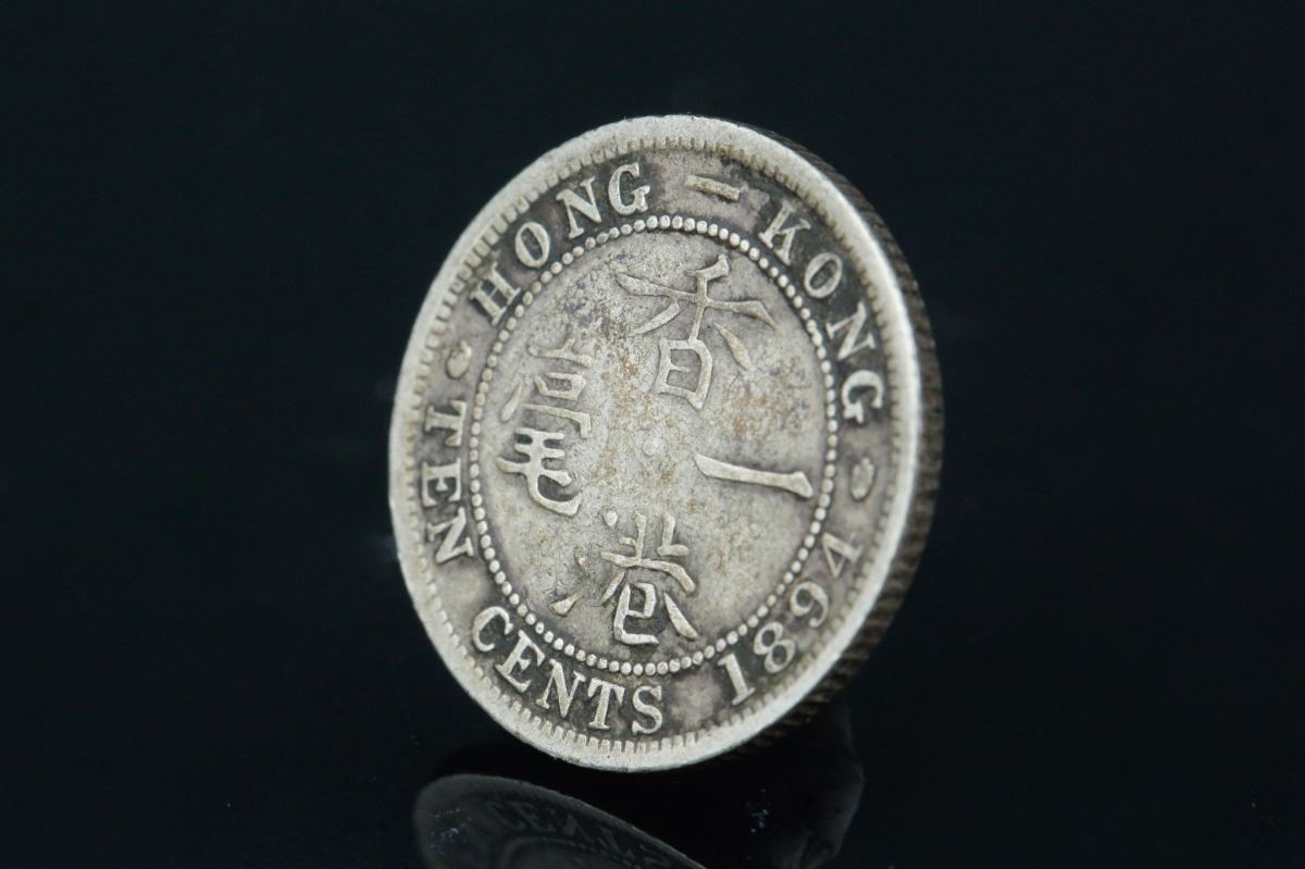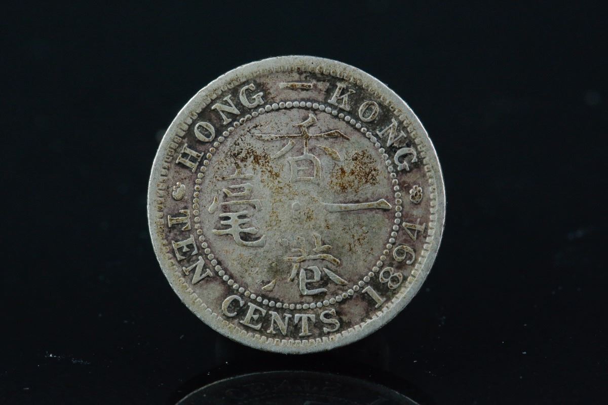 Chinese Hong Kong silver coin; Hong Kong Ten Cents 1894 on front and QUEEN VICTORIA with portrait on back; D: 15 mm, 2 grams; silver purity not tested