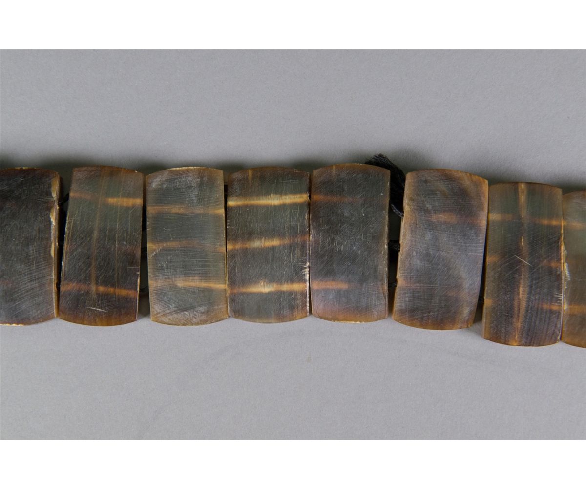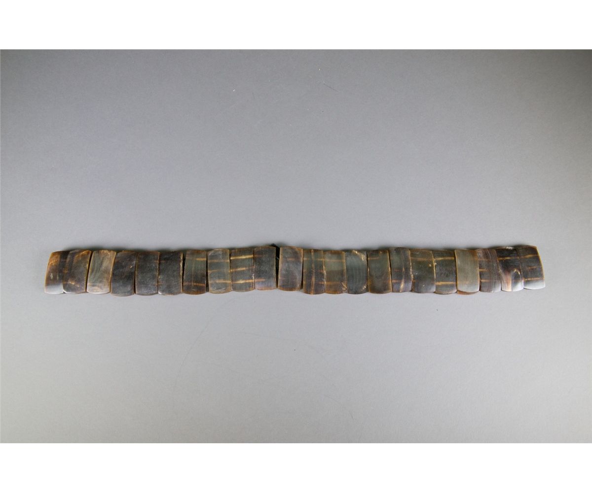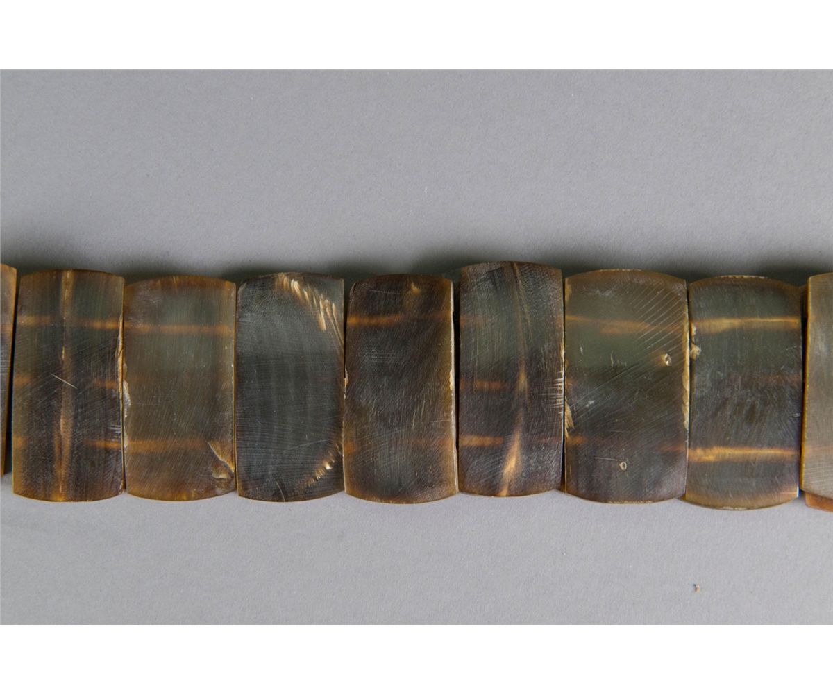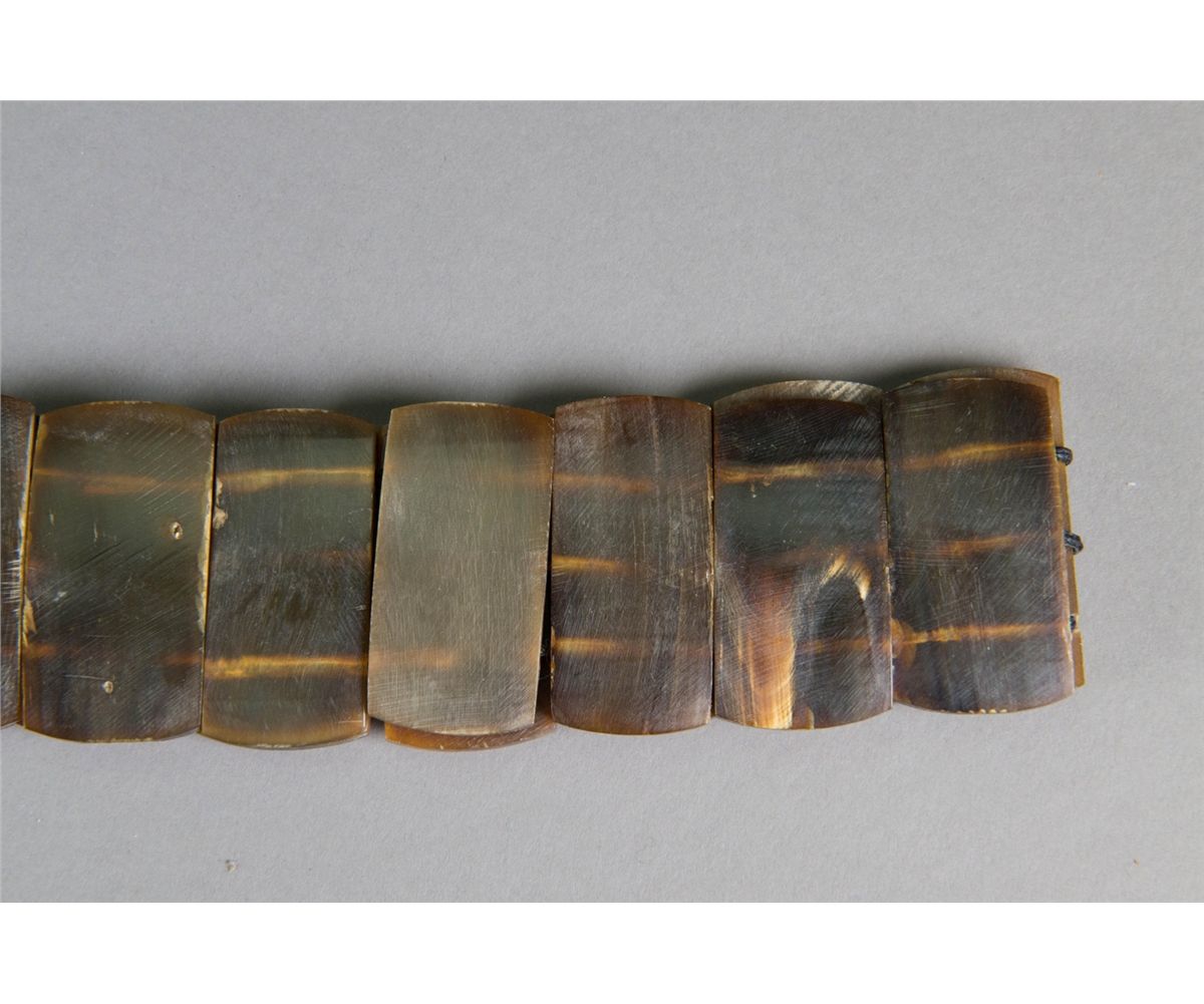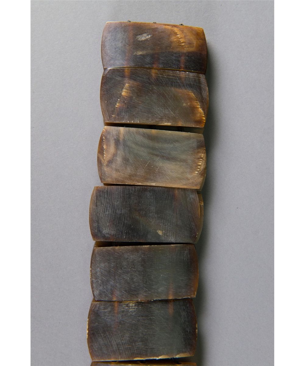 Chinese horn carved belt; comprised of horn carved rectangle sections; of dark brown tone; L: 64 cm, W: 2 cm, 254 grams