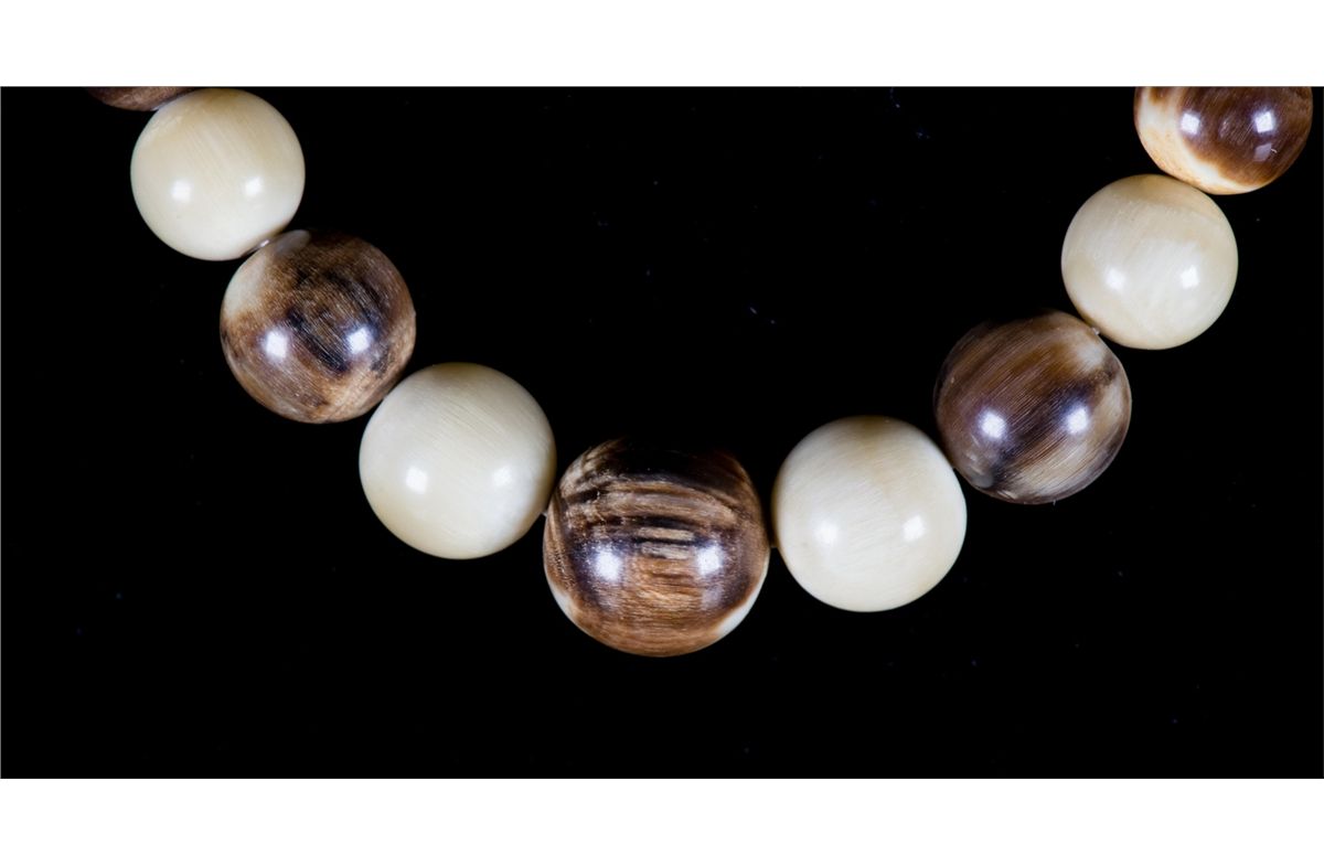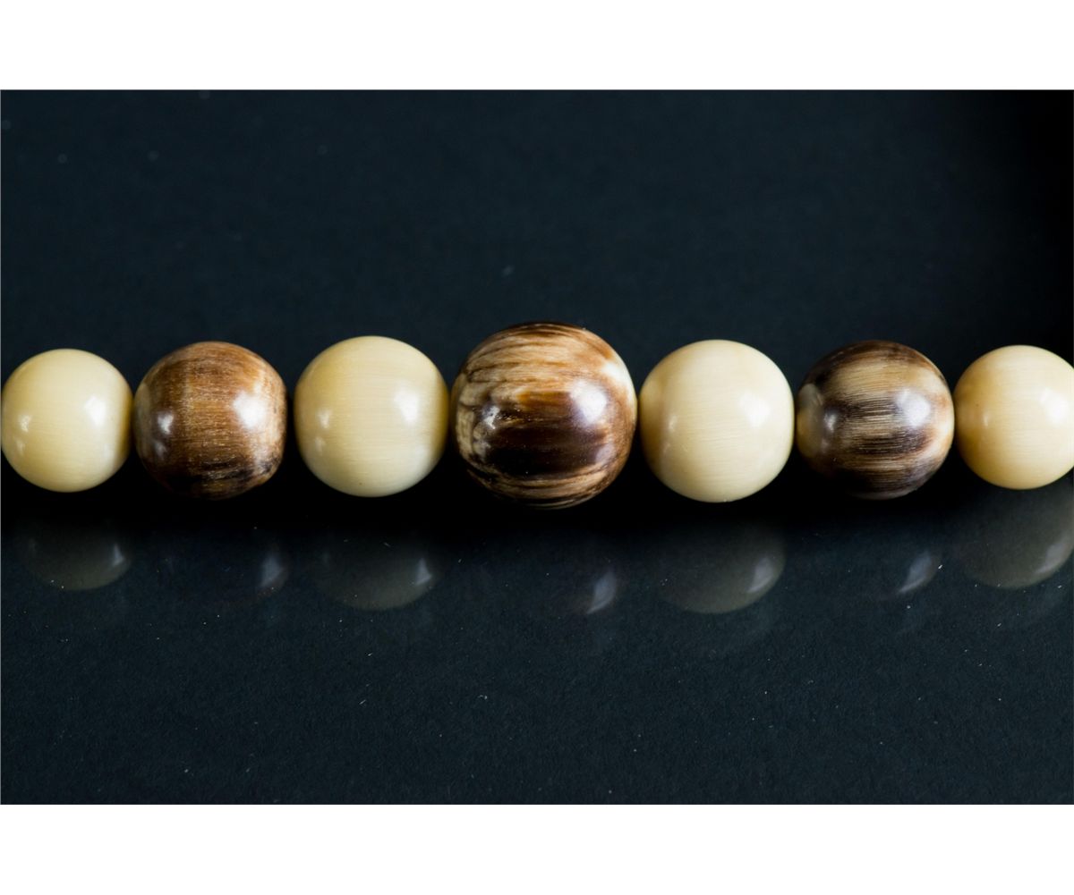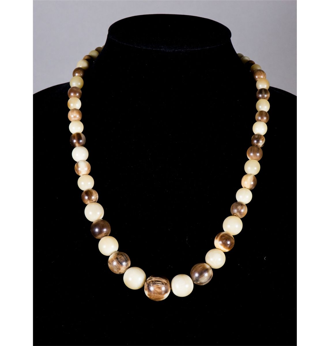 Chinese horn carved necklace; comprised of brown round beads alternating with white beads; D: 21 cm, 54 grams