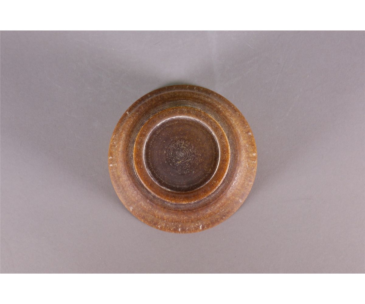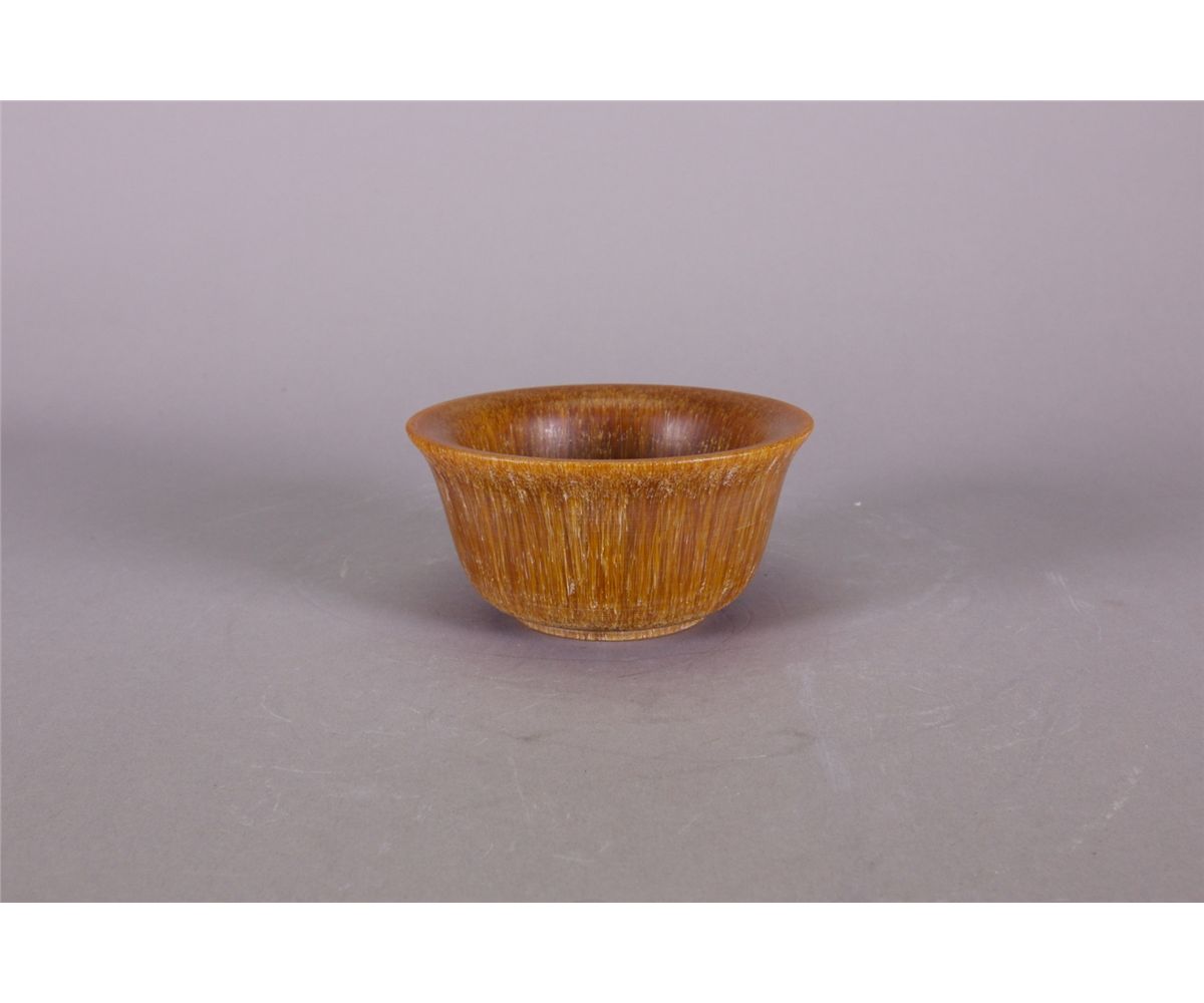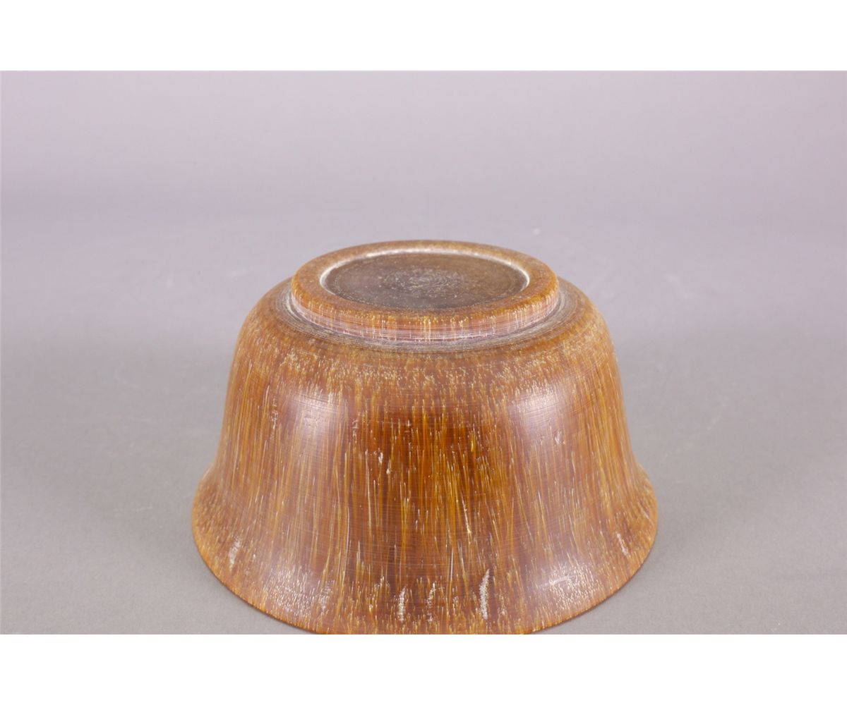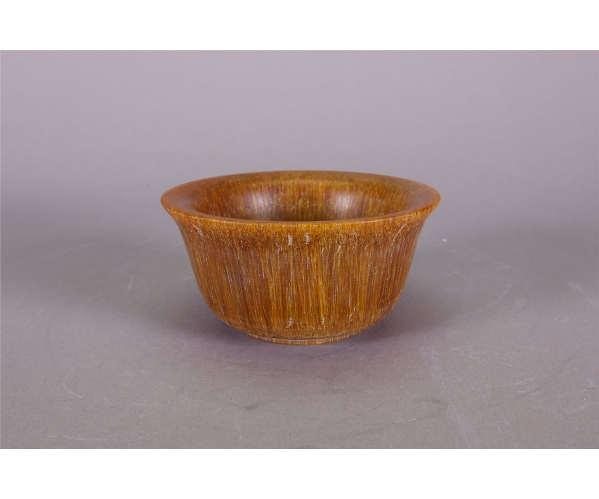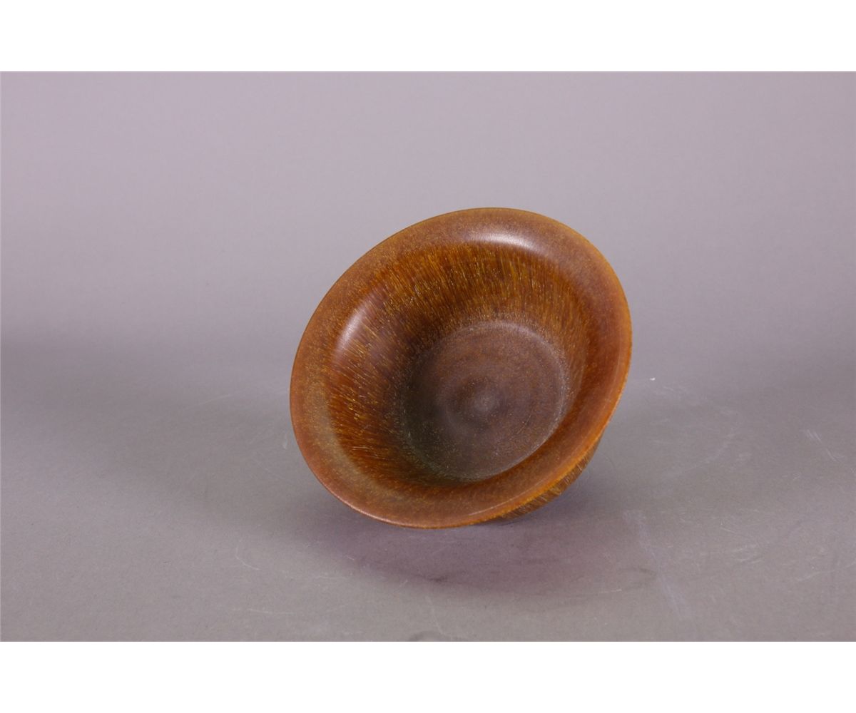 Chinese horn carved libation cup; supported on short foot rim; of deep caramel tone; H: 6 cm, D: 12 cm, 274 grams
