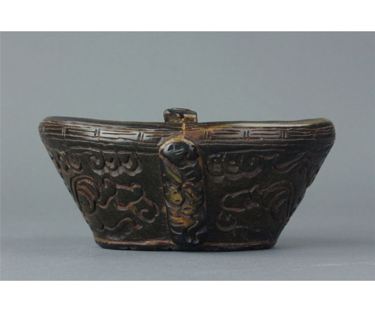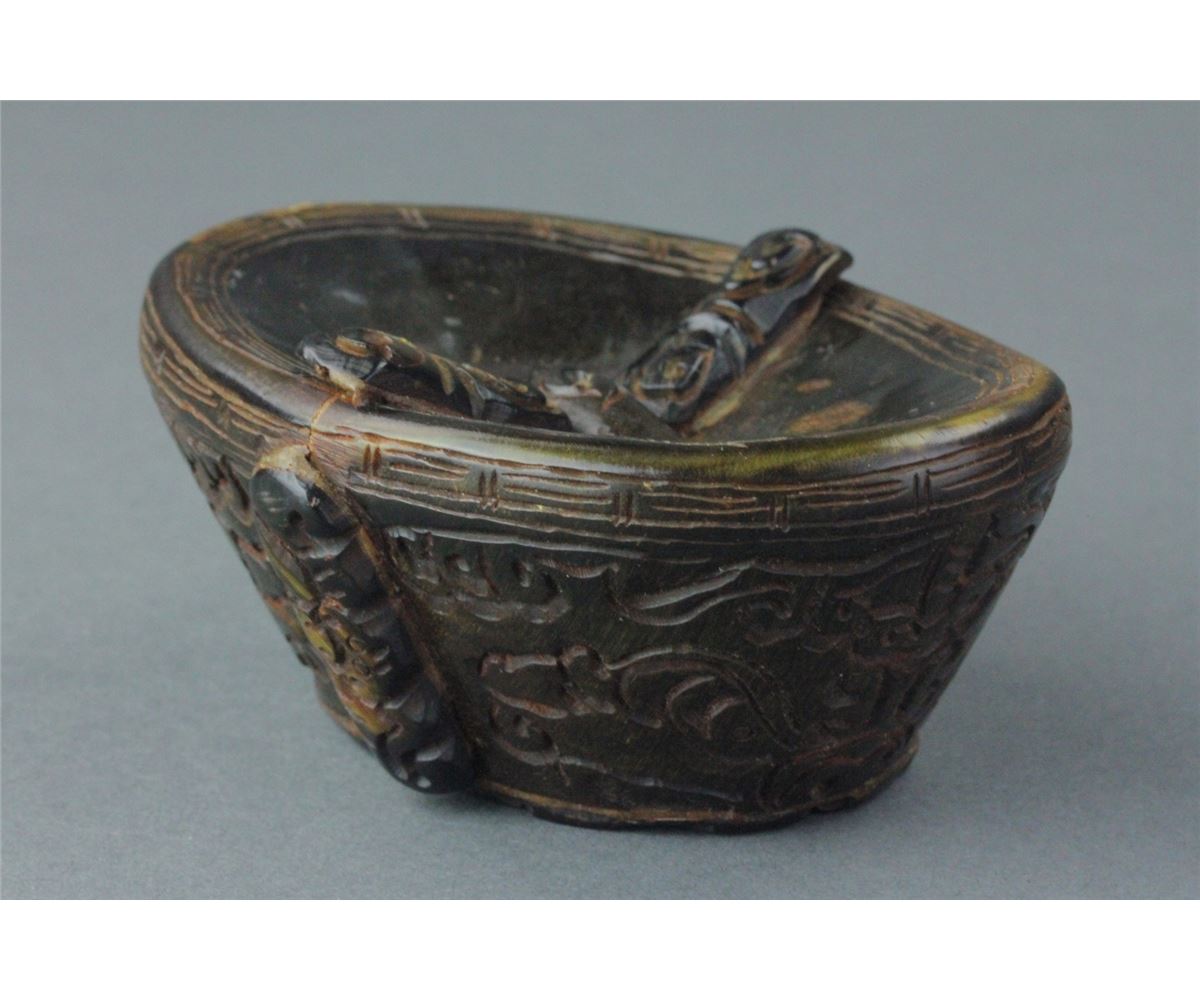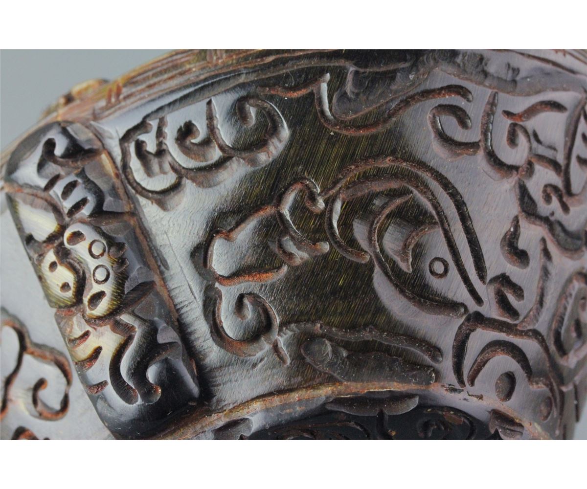 Chinese horn carved libation cup; of bell form; featuring carvings of archaistic pattern on body; H: 4.5 cm, W: 12 cm, 260 grams