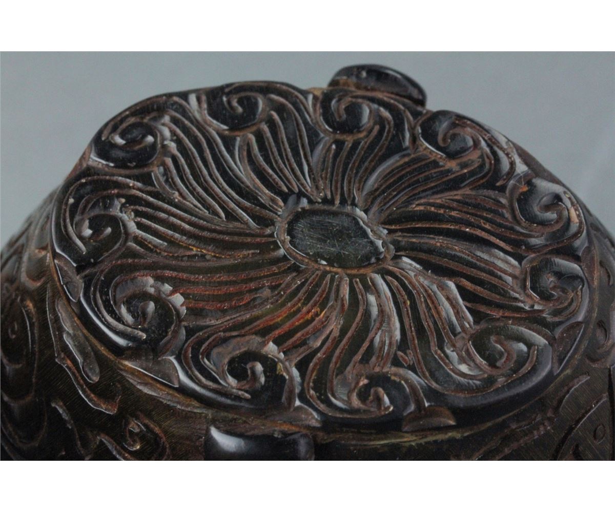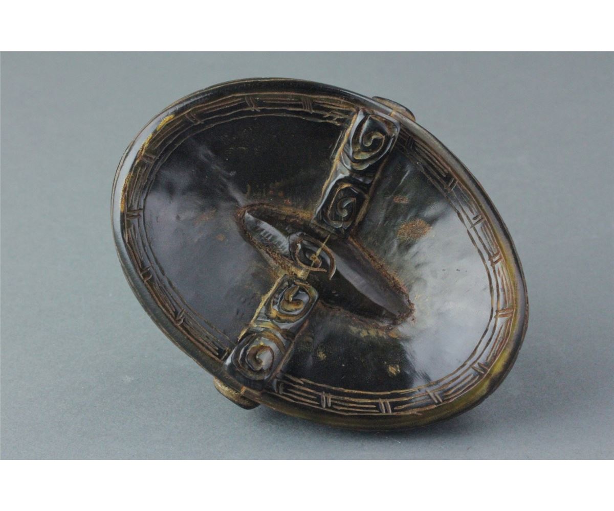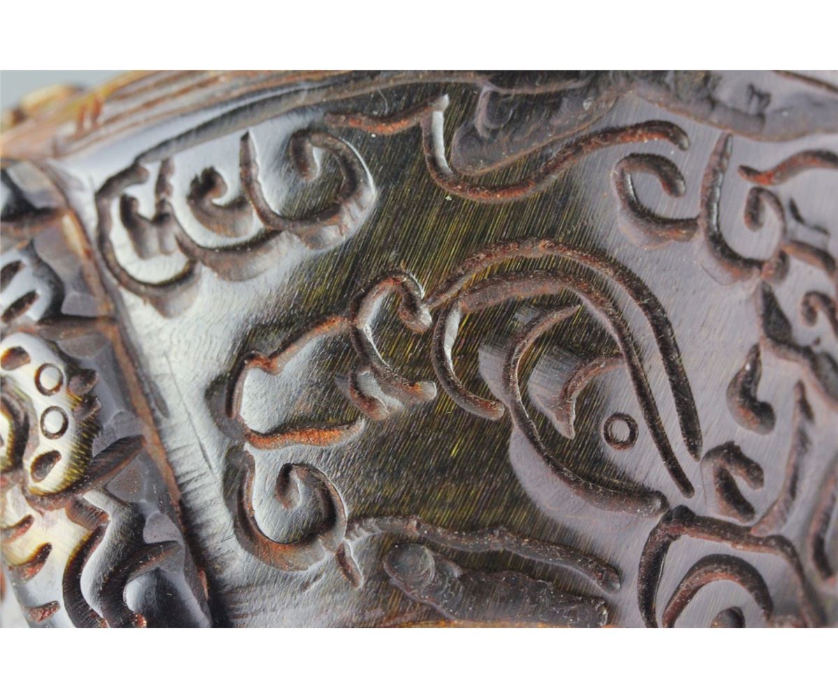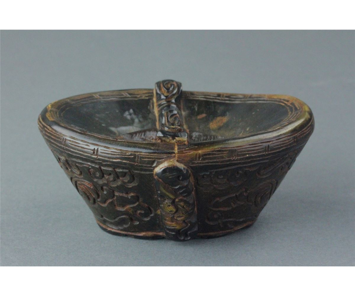 Chinese horn carved libation cup; of bell form; featuring carvings of archaistic pattern on body; H: 4.5 cm, W: 12 cm, 260 grams