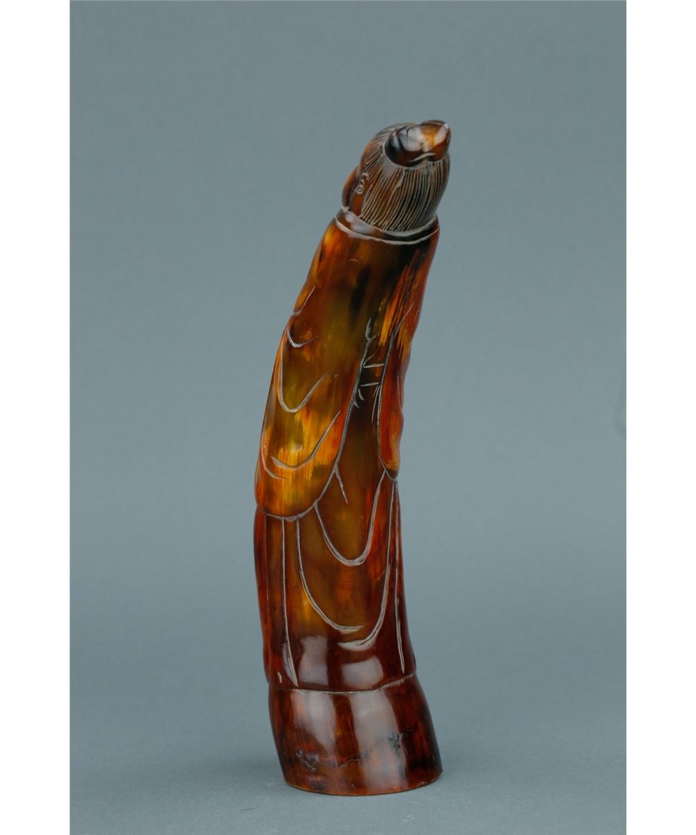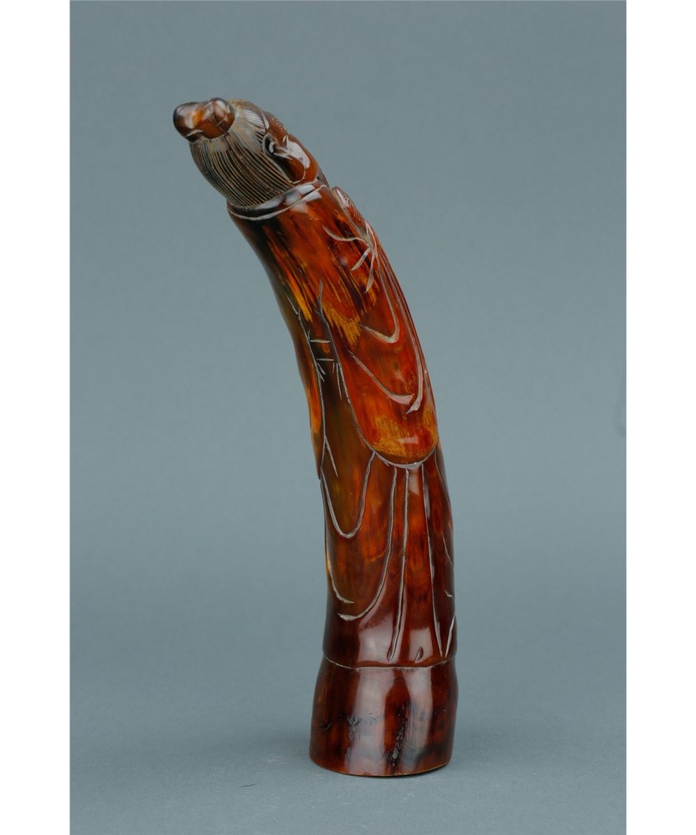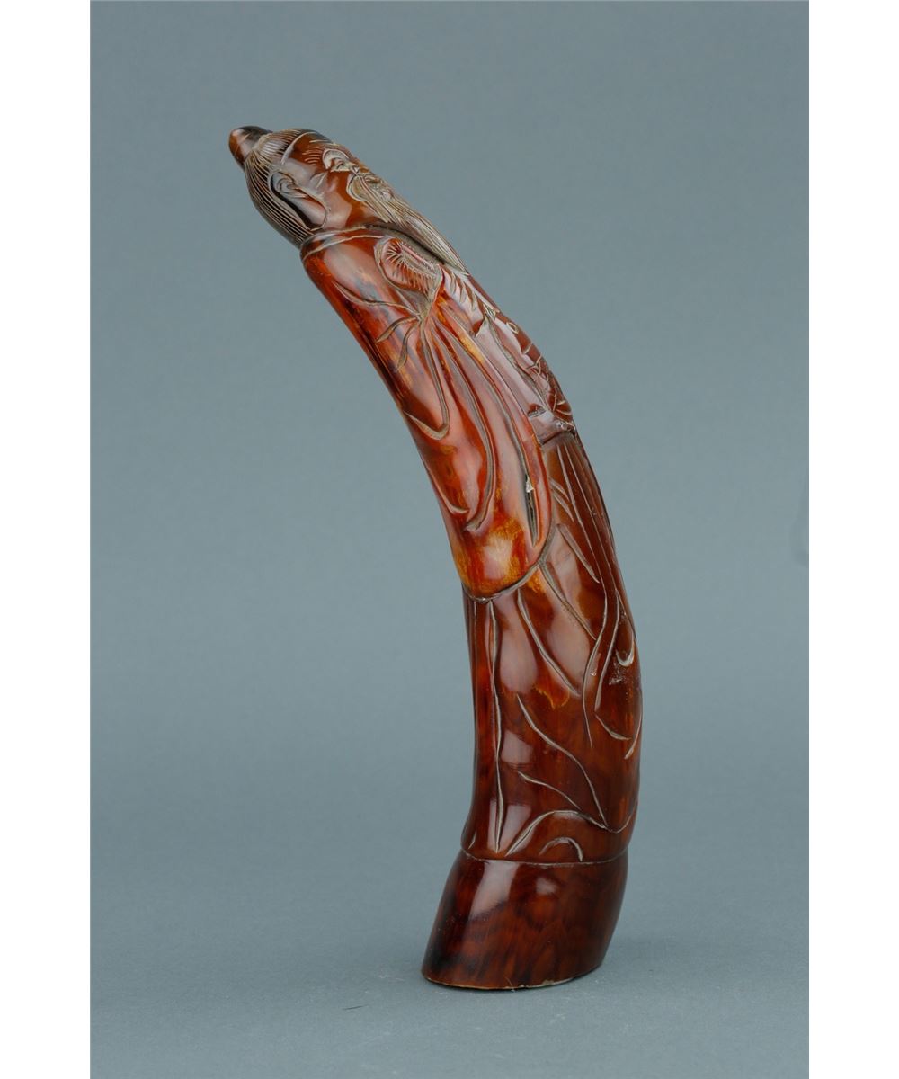 Chinese horn carved figure; of curved horn shape; featuring detailed carvings of an old man holding a fish; of mahogany tone; H: 28 cm, D: 6 cm, 537 grams
