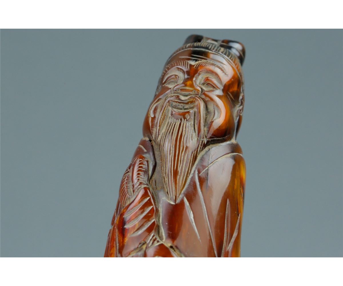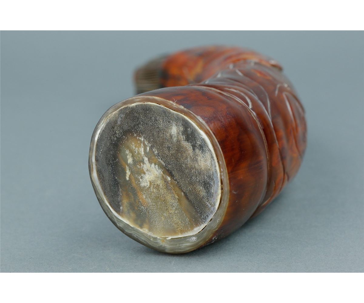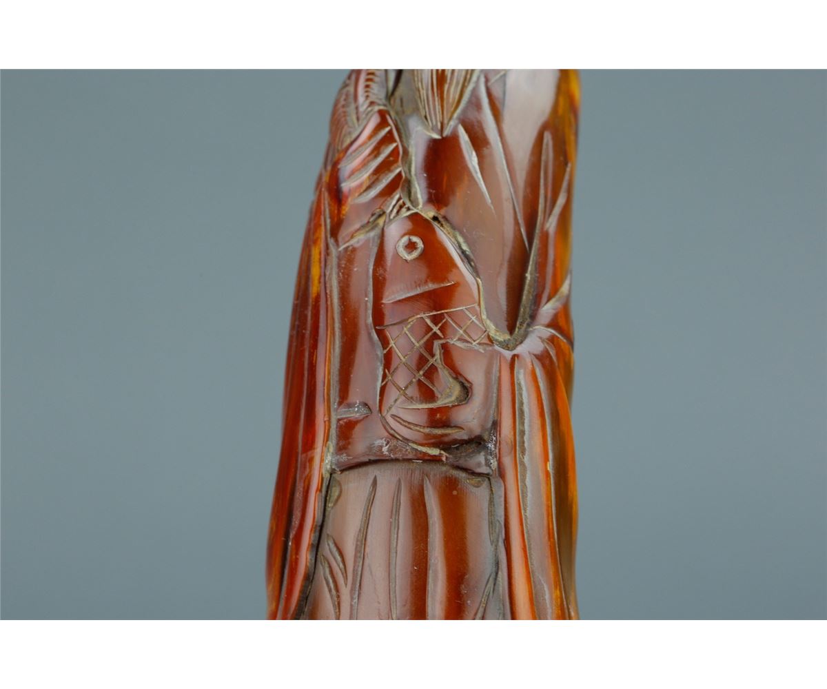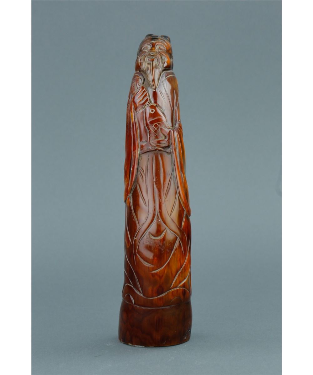 Chinese horn carved figure; of curved horn shape; featuring detailed carvings of an old man holding a fish; of mahogany tone; H: 28 cm, D: 6 cm, 537 grams