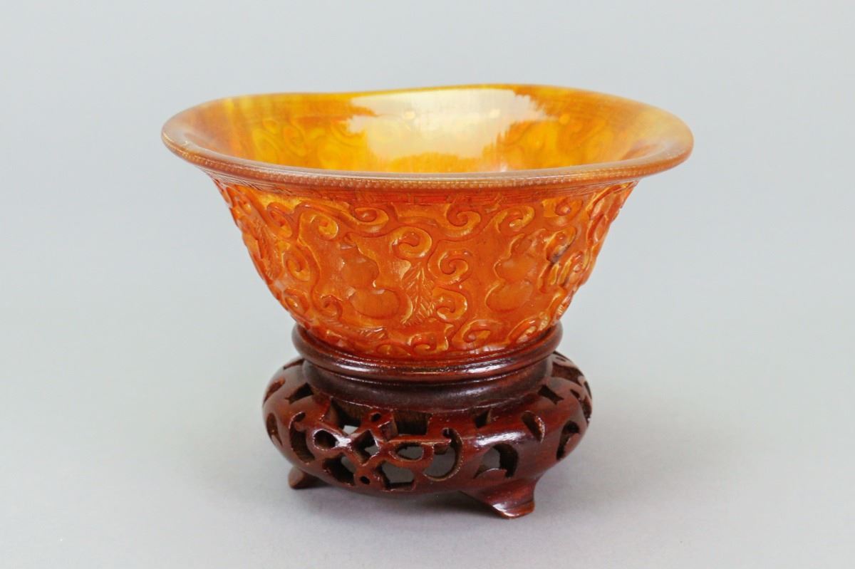 Chinese horn carved bowl; featuring low-relief carvings of scrolling calabash; of honey yellow tone; custom wood stand included; H: 4.5 cm, D: 11 cm, 50 grams