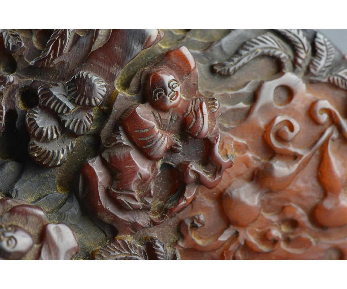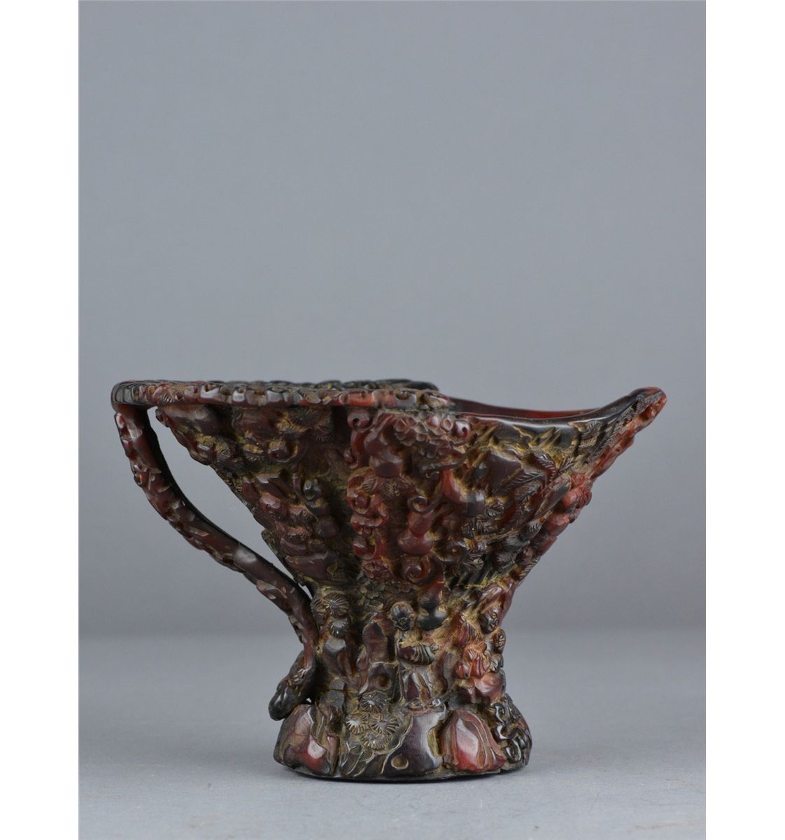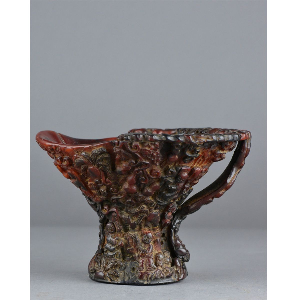 Chinese horn carved libation cup; featuring continuous figural Immortal scene with handle in relief; L: 15.5 cm, W: 14.5 cm, H: 11 cm, 431 grams