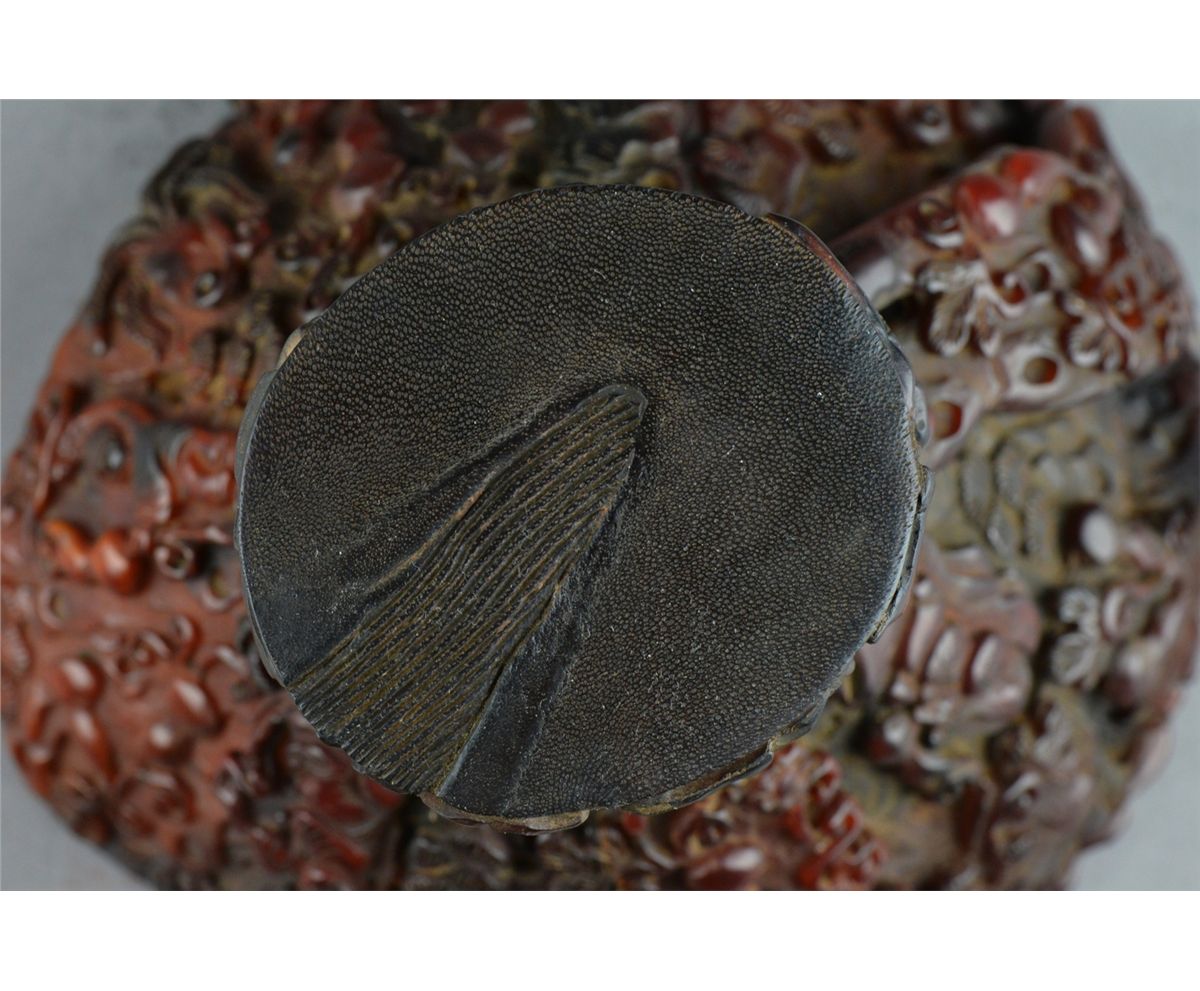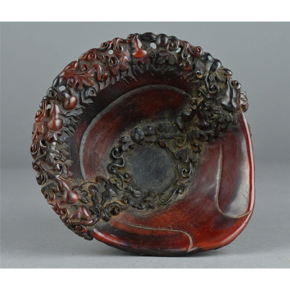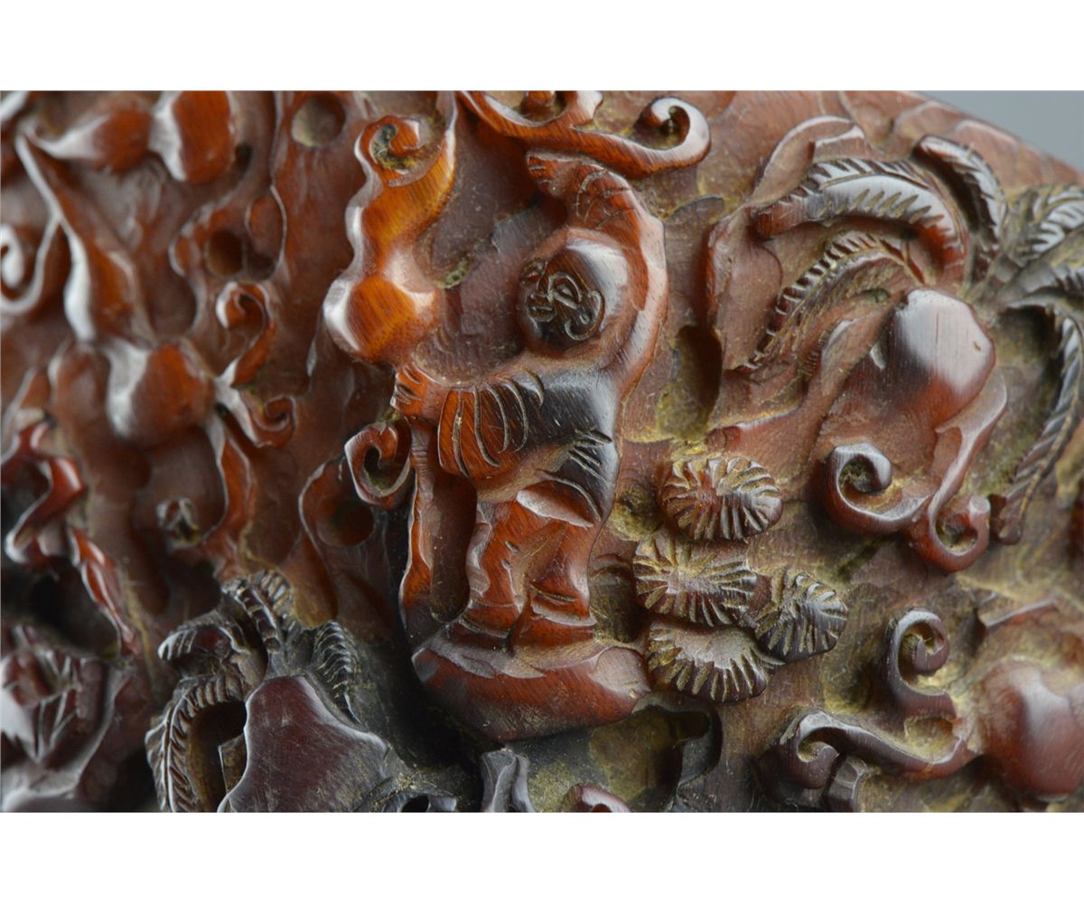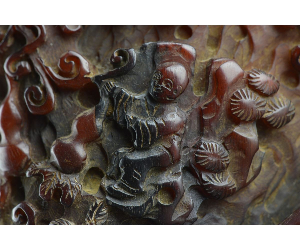 Chinese horn carved libation cup; featuring continuous figural Immortal scene with handle in relief; L: 15.5 cm, W: 14.5 cm, H: 11 cm, 431 grams