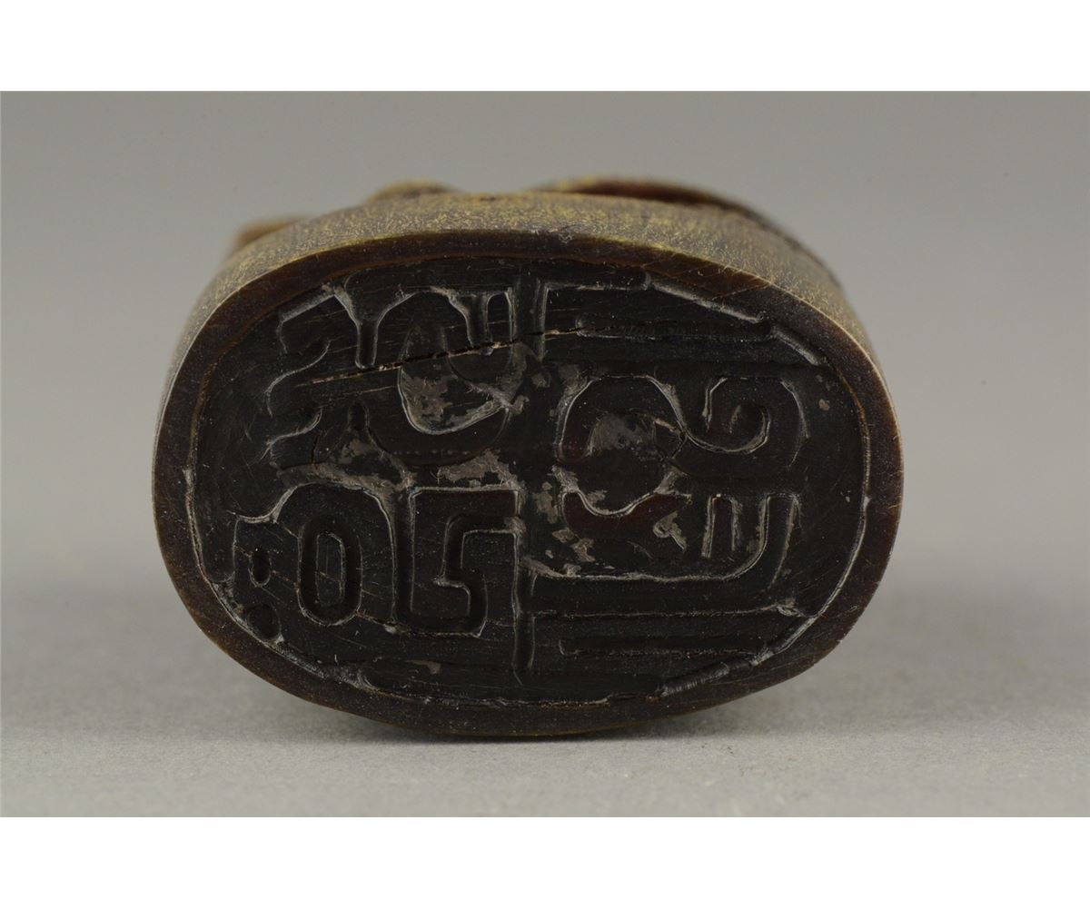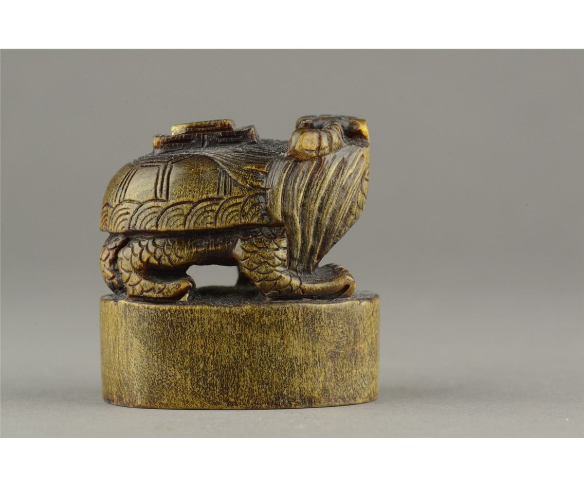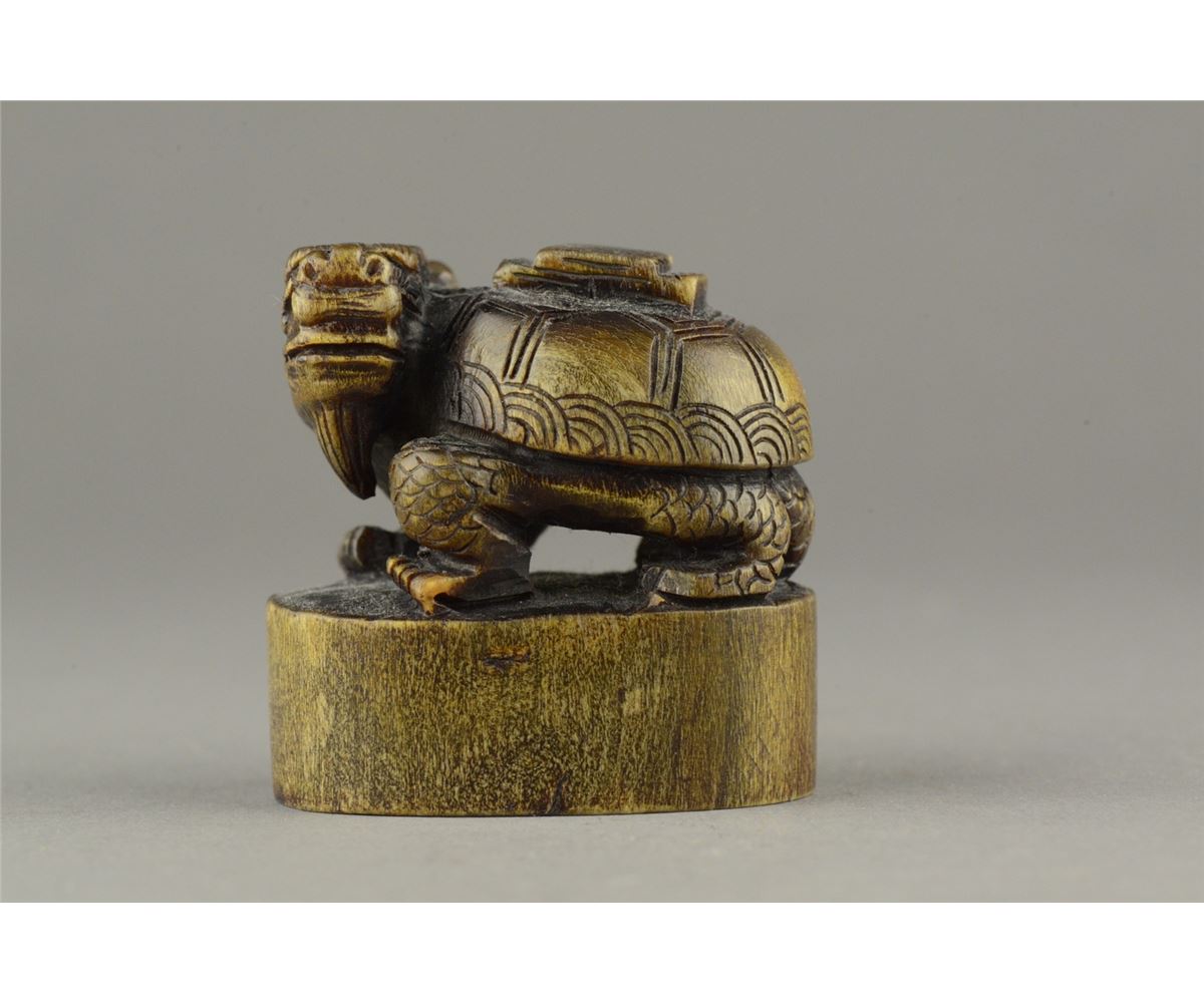 Chinese horn carved seal; of cylindrical seal surmounted with an recumbent tortoise; bottom carved four archaic Chinese characters; H: 5.5 cm, W: 5.5 cm, 80 grams