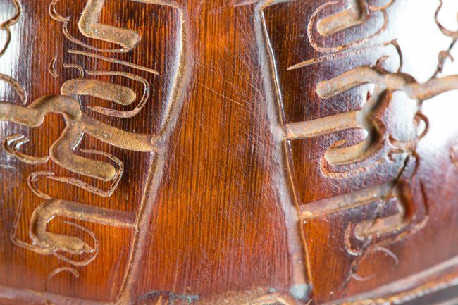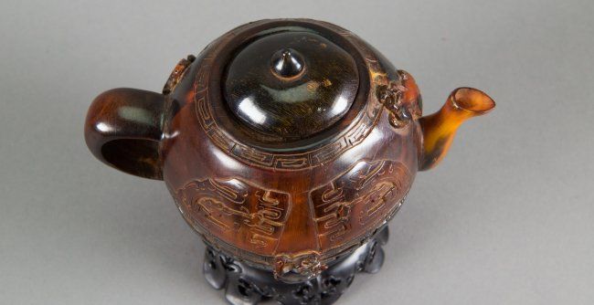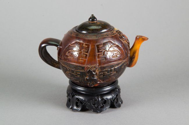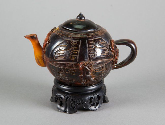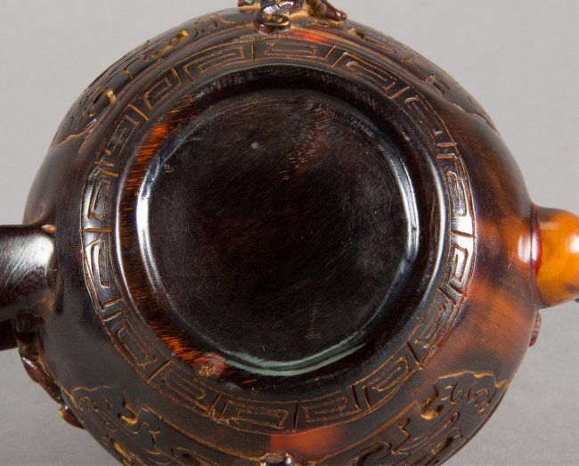 Chinese horn carved tea pot, body of globular form with incised designs and chilong on body with intact lid ; H: 10 cm, W: 14 cm, 180 grams