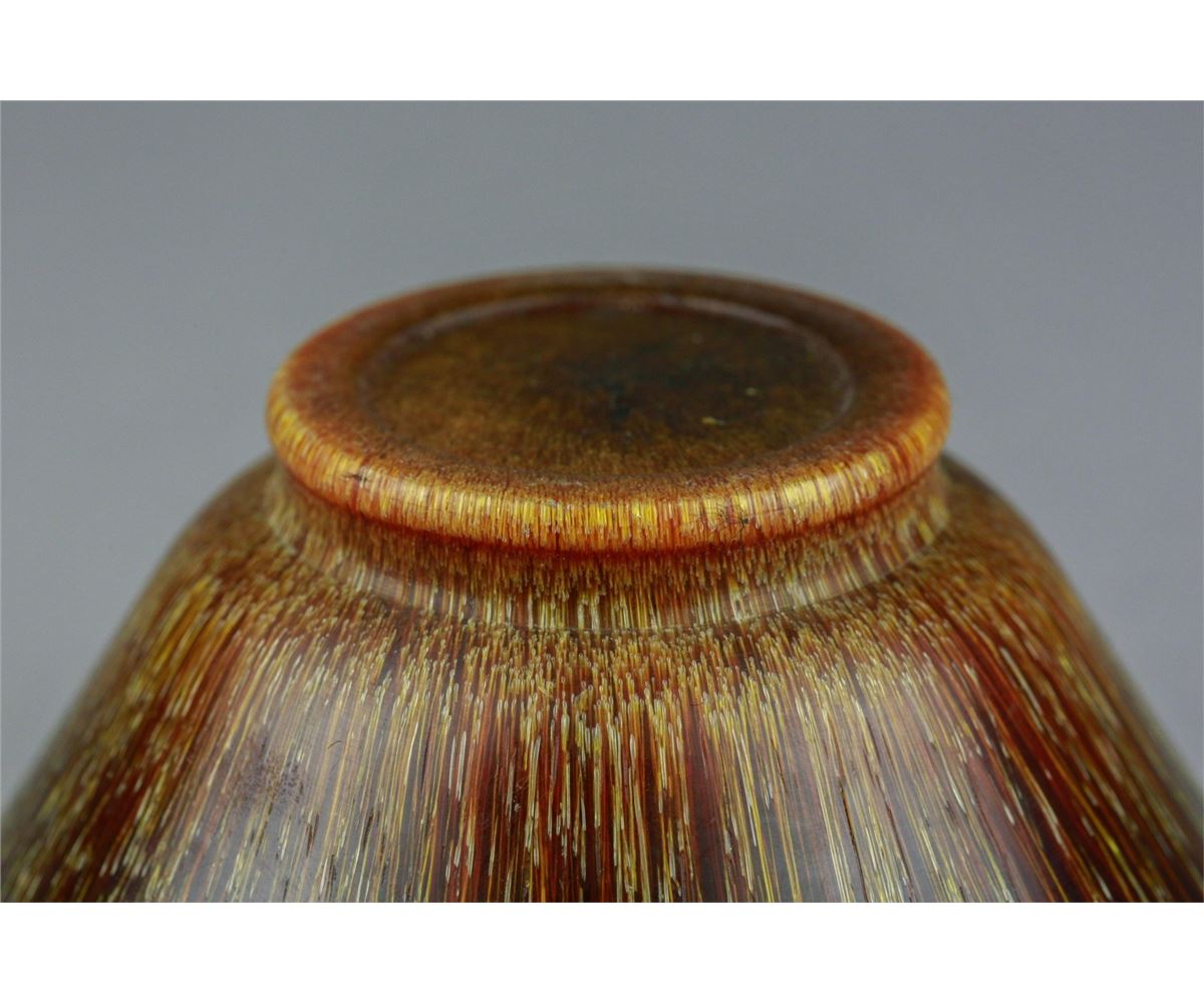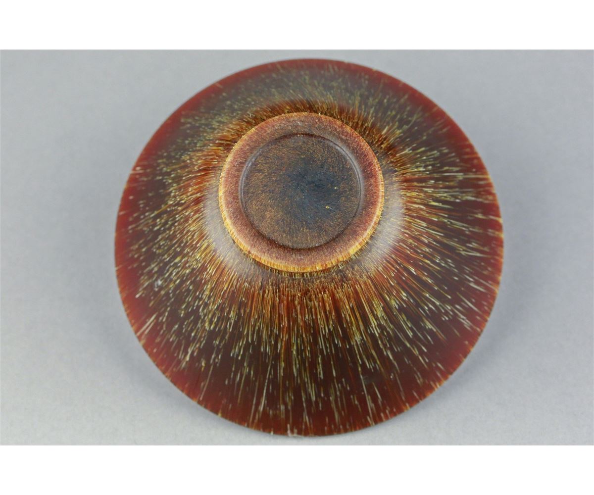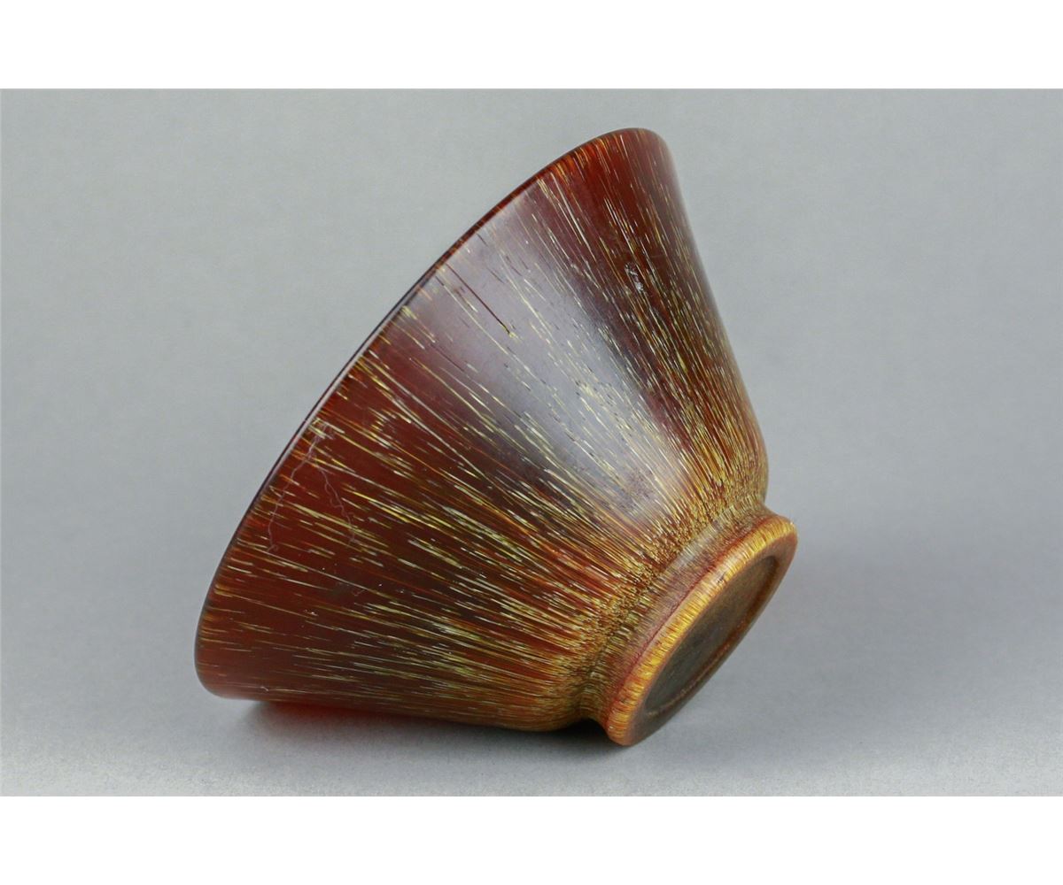 Chinese horn carved cup; supported on short foot rim; of dark brown tone with hair-like grain; H: 7 cm, D: 13 cm, 271 grams