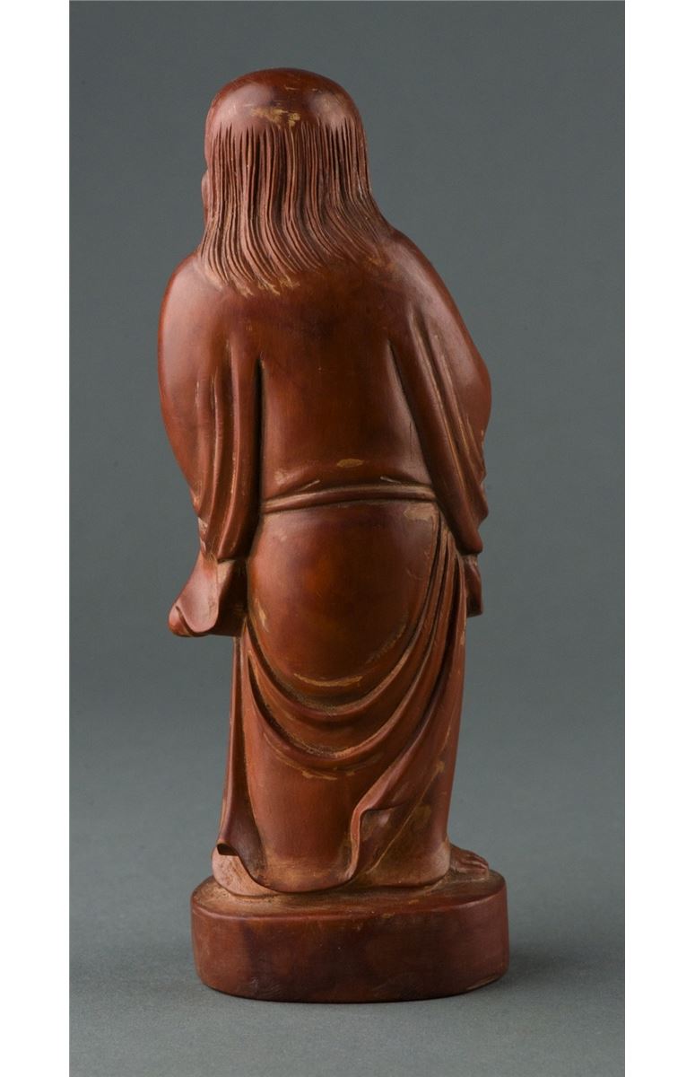 Chinese Huang Mu carved statue, of rich brown tone, featuring serene expression Buddha in robes holding a fish, implies happiness and prosperity. H: 18.5 cm, W: 6 cm, 279 grams.