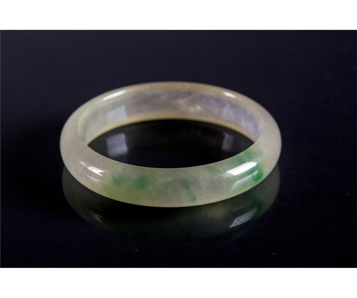 Chinese icy green jadeite bangle; of celadon green tone with emerald green suffusions; D: 7.5 cm, Inner D: 5.8 cm, 48 grams; Density: 3.31