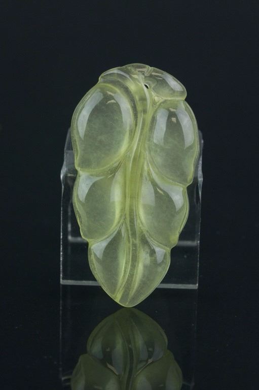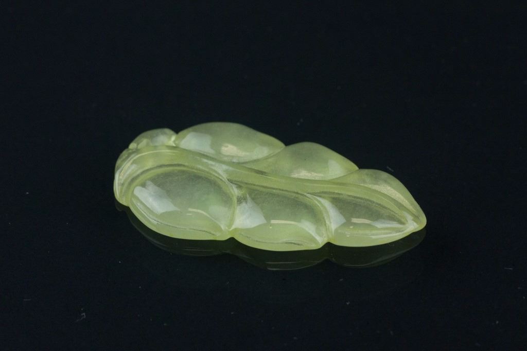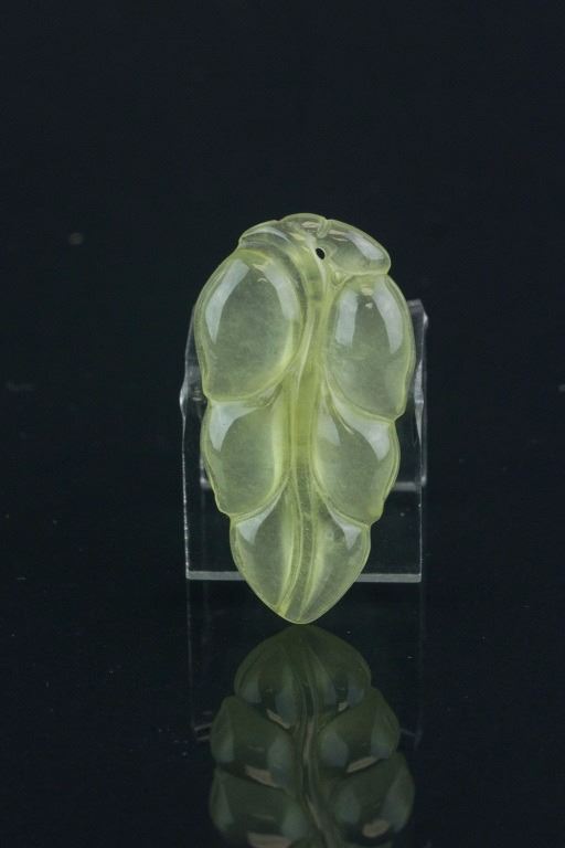 Chinese icy jadeite pendant; carved in form of a leaf; of translucent pale yellow tone; pierced for suspension; H: 4.5 cm, W: 2 cm, 2 grams, Density: 3.29