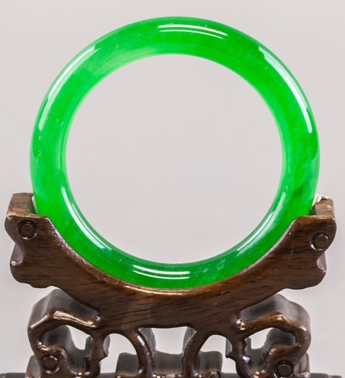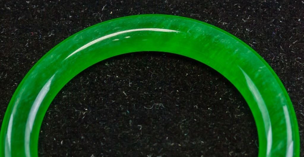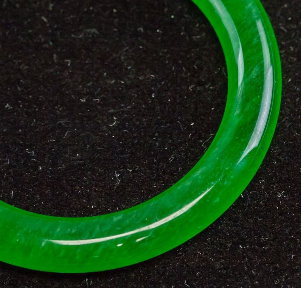 Chinese jadeite carved bangle. Of translucent imperial green tone.