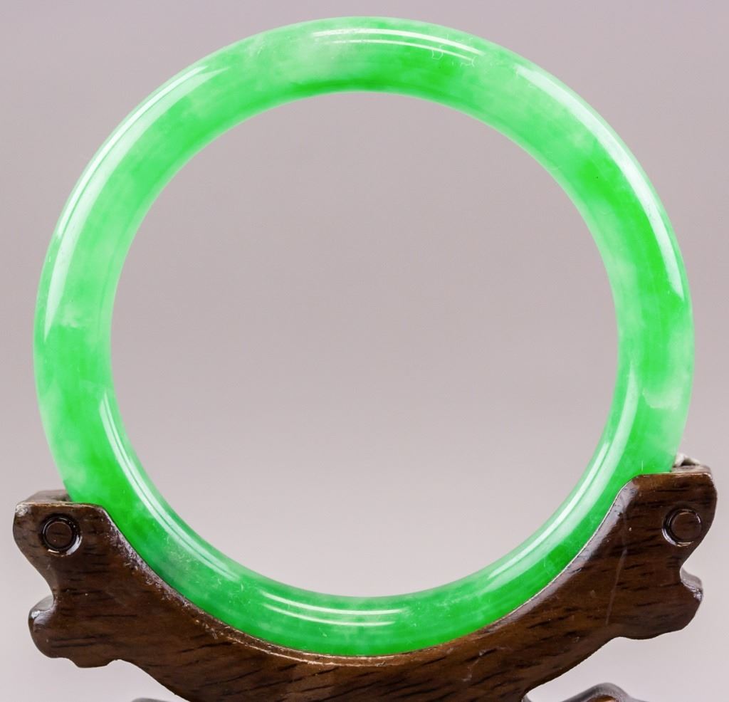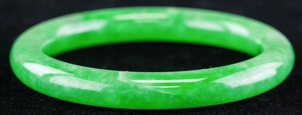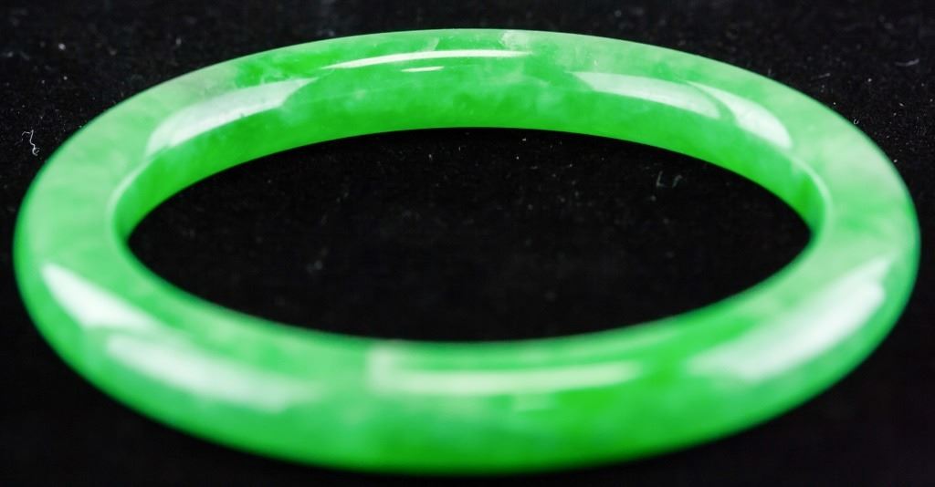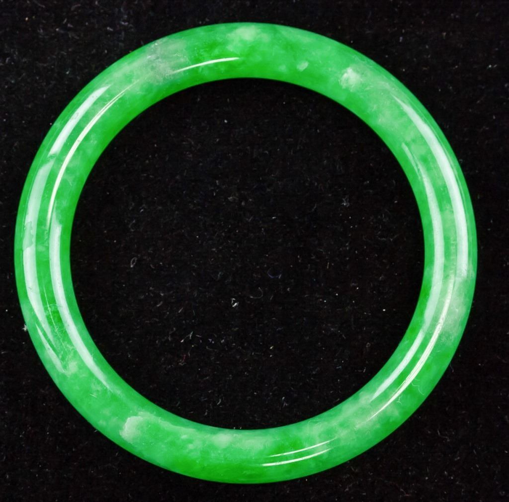 Chinese jadeite bangle. Of green tone with white inclusions. Of rounded inside and outside. Inner diameter: 6 cm. Outer diameter: 7.5 cm. 42.74 grams. Density: 3.25.