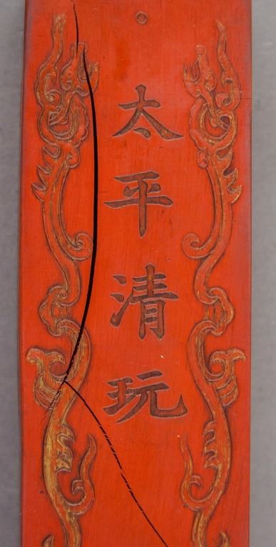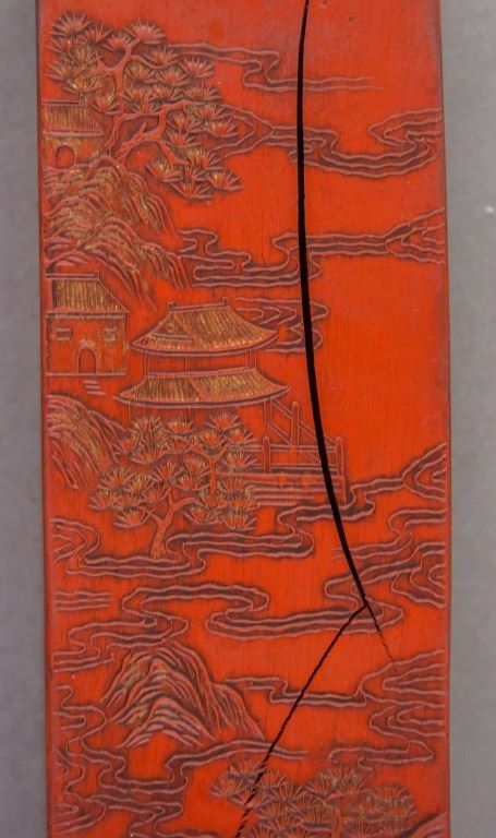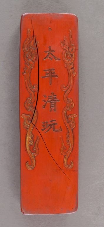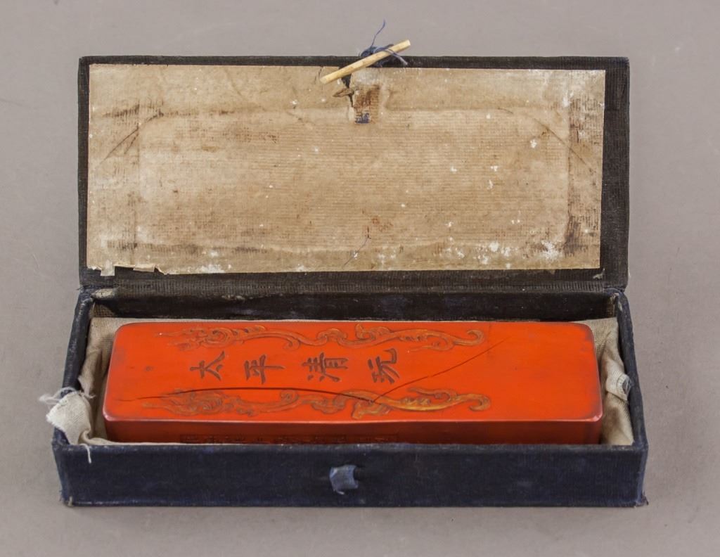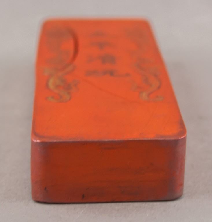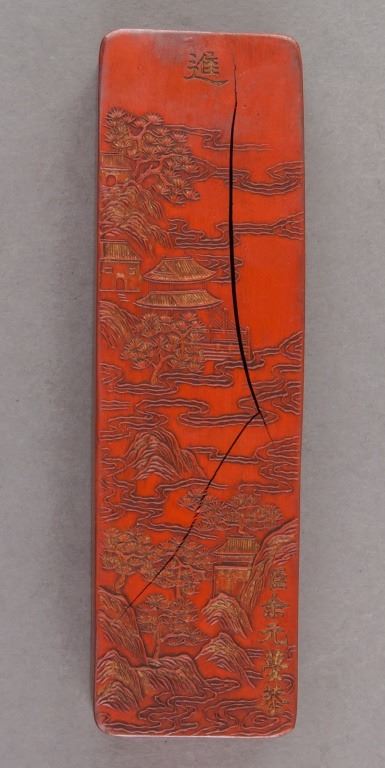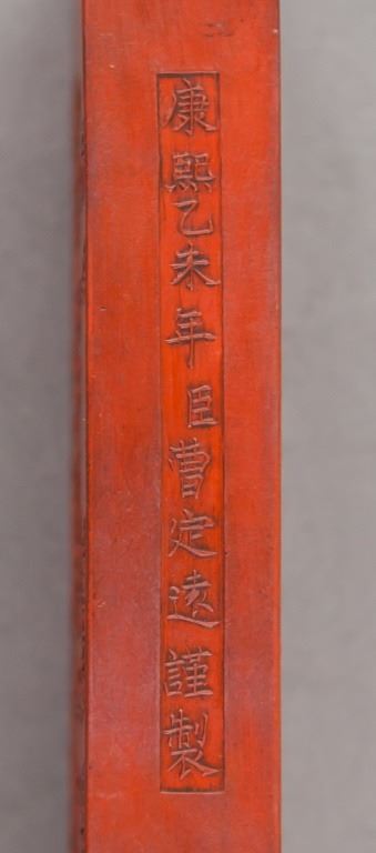 Chinese ink stick. Of red tone. Carved with scenery. Engraged with "Kangxi". 14 x 4 cm. 482 grams (including box).