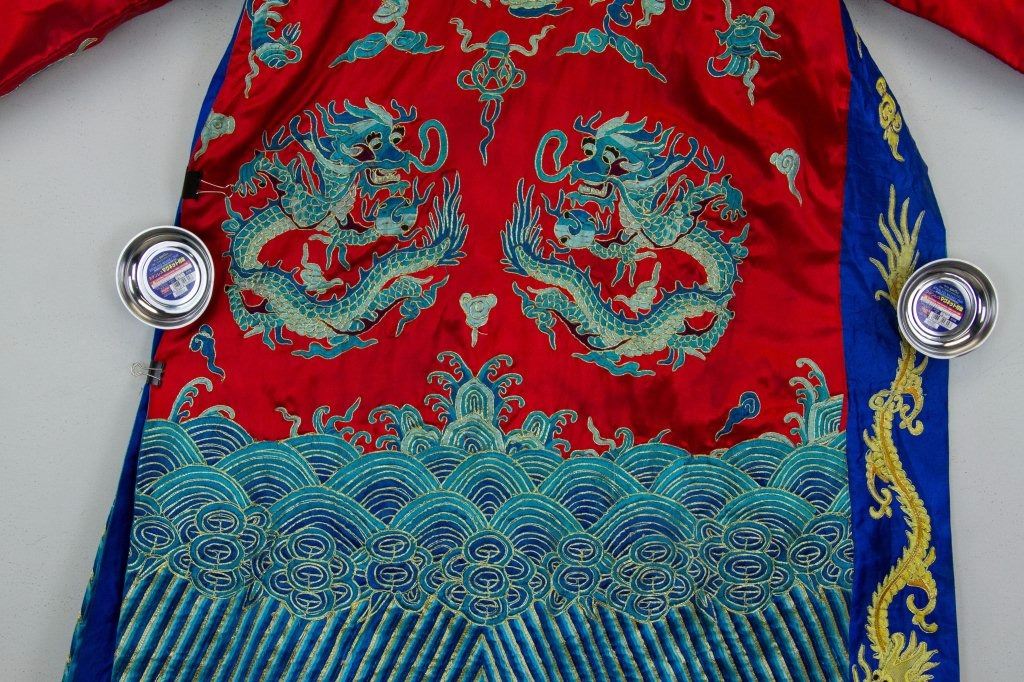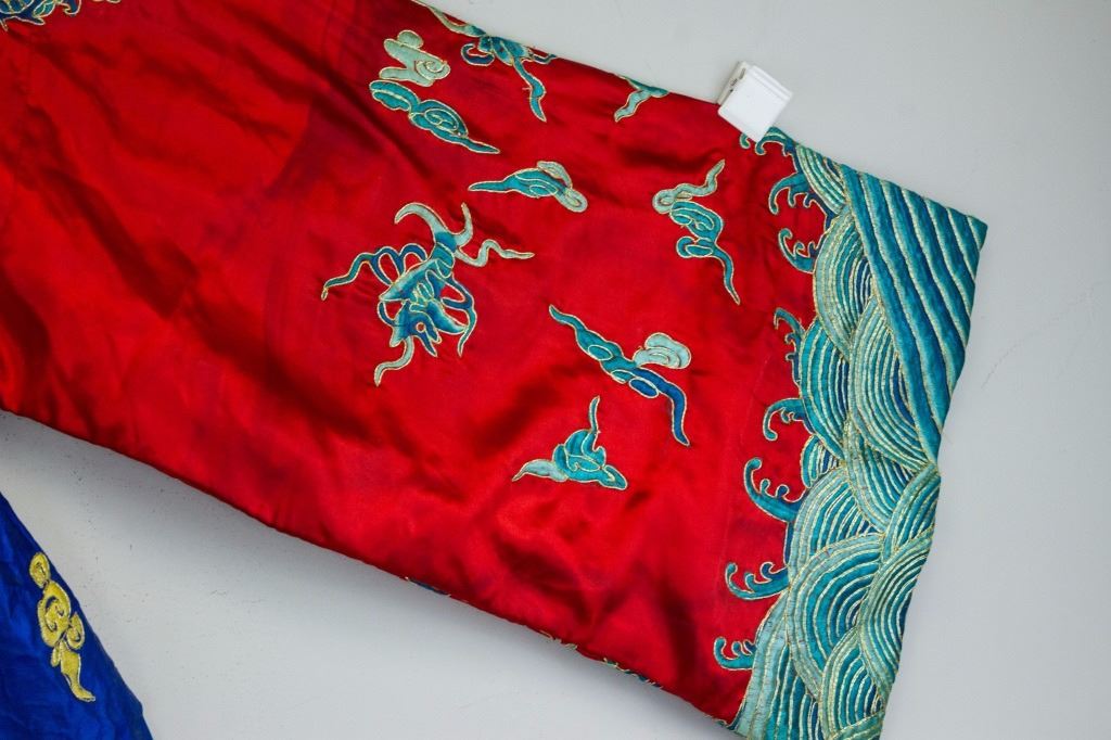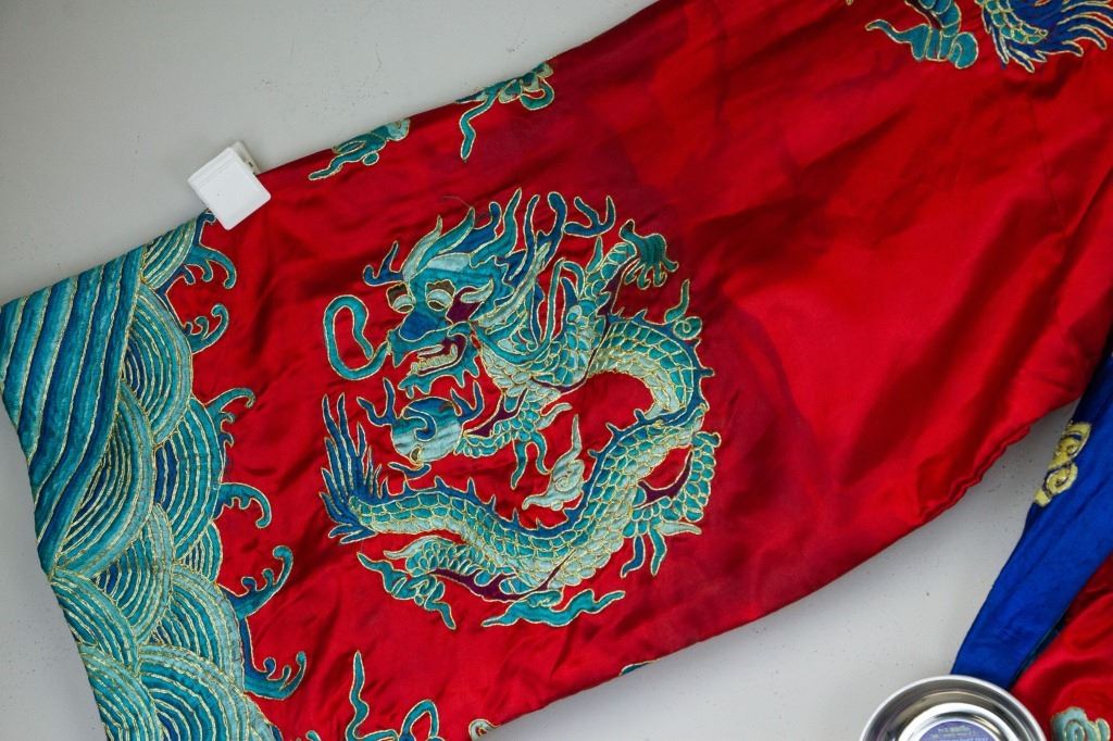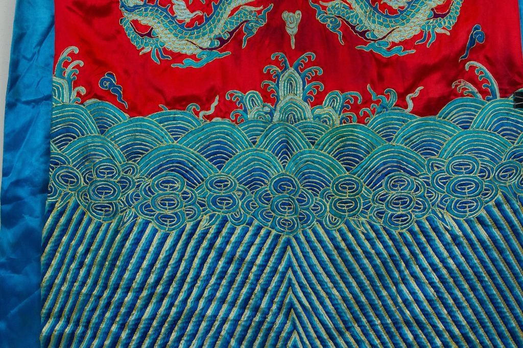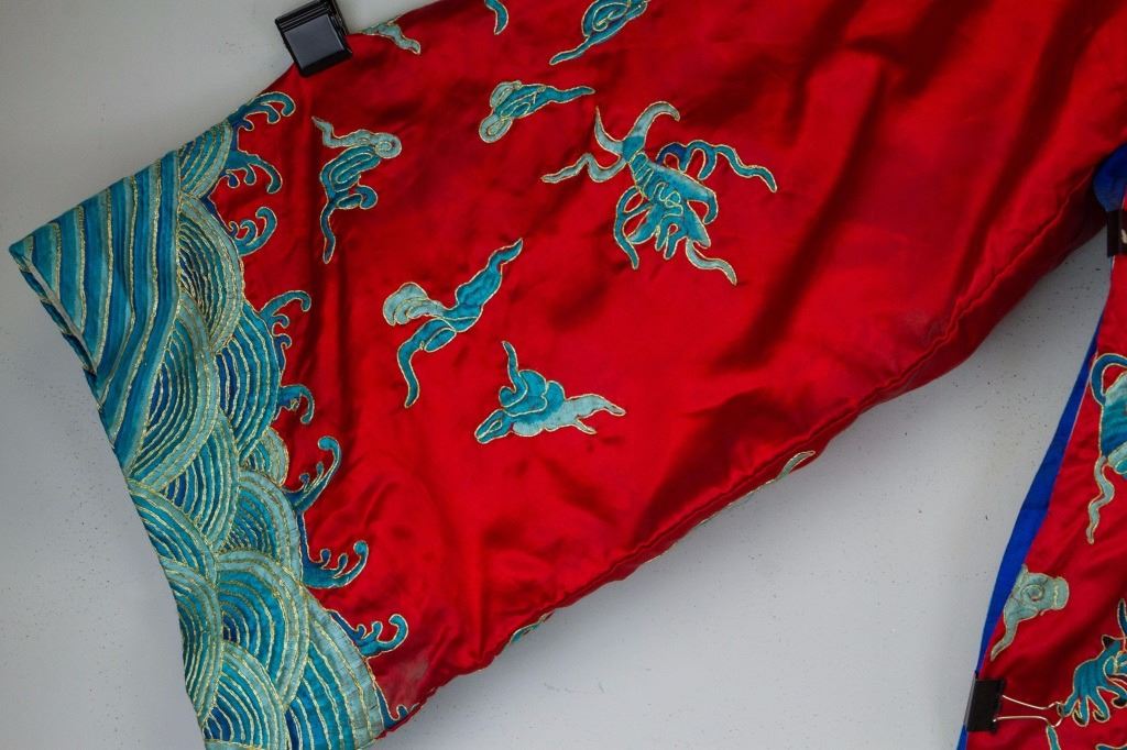 Chinese imperial type dragon robe; of red colour; with dragon pattern on body and sleeves; with wave pattern on sleeves' edge; with blue waist band; geometric and wave pattern on robe drape; H: 158 cm, W of sleeves: 80 cm, Waist: 65 cm