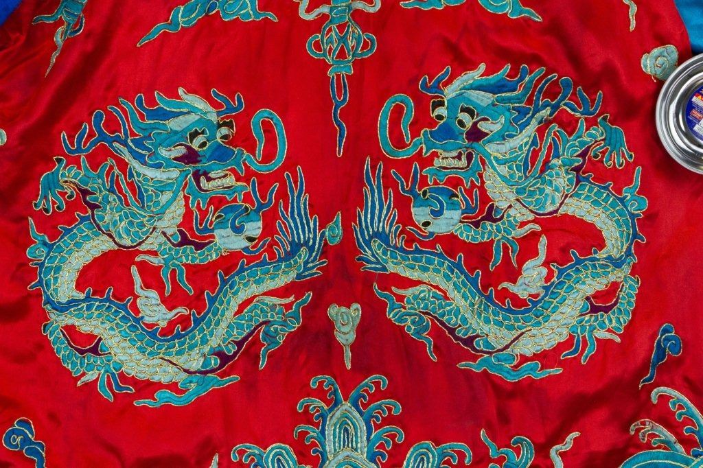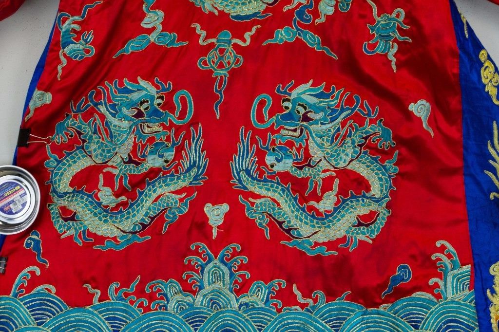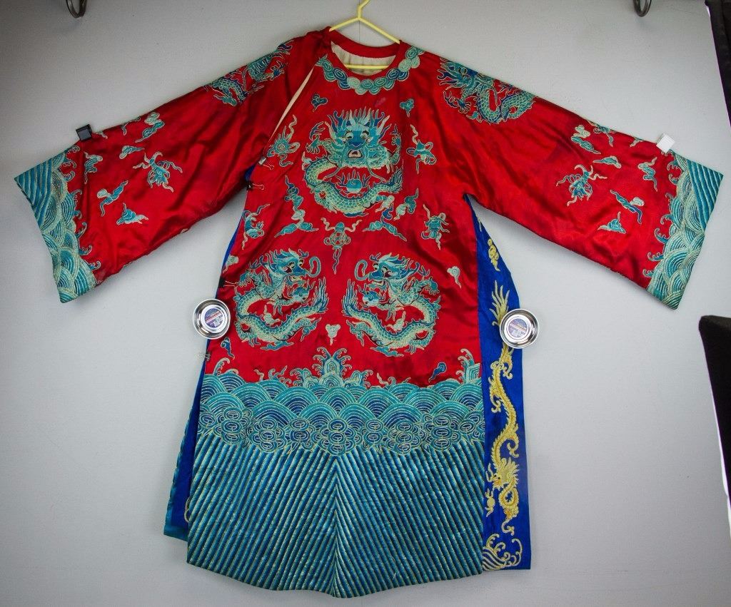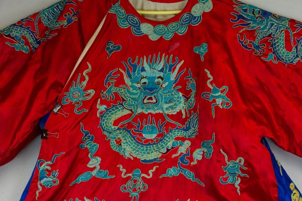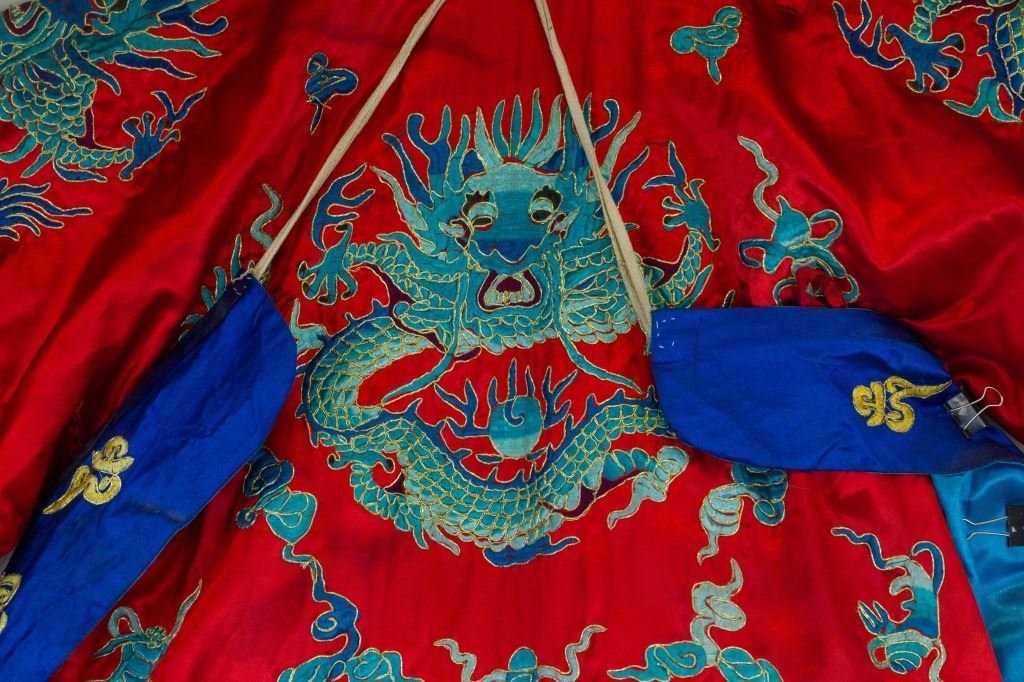 Chinese imperial type dragon robe; of red colour; with dragon pattern on body and sleeves; with wave pattern on sleeves' edge; with blue waist band; geometric and wave pattern on robe drape; H: 158 cm, W of sleeves: 80 cm, Waist: 65 cm