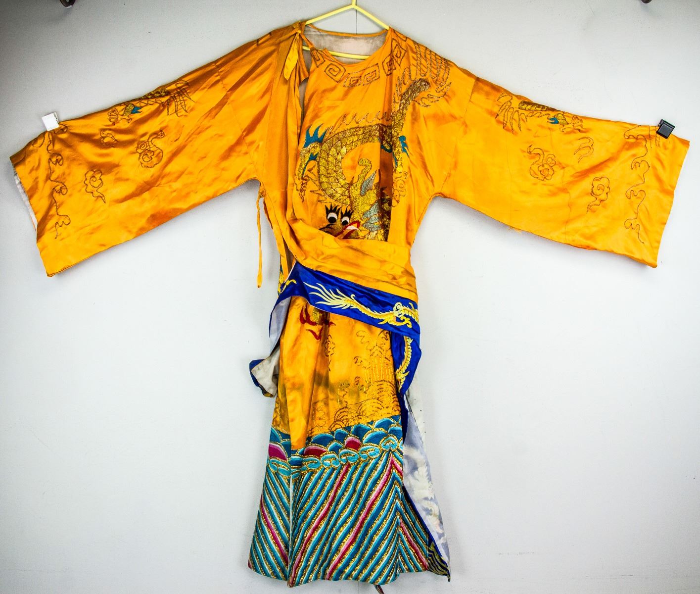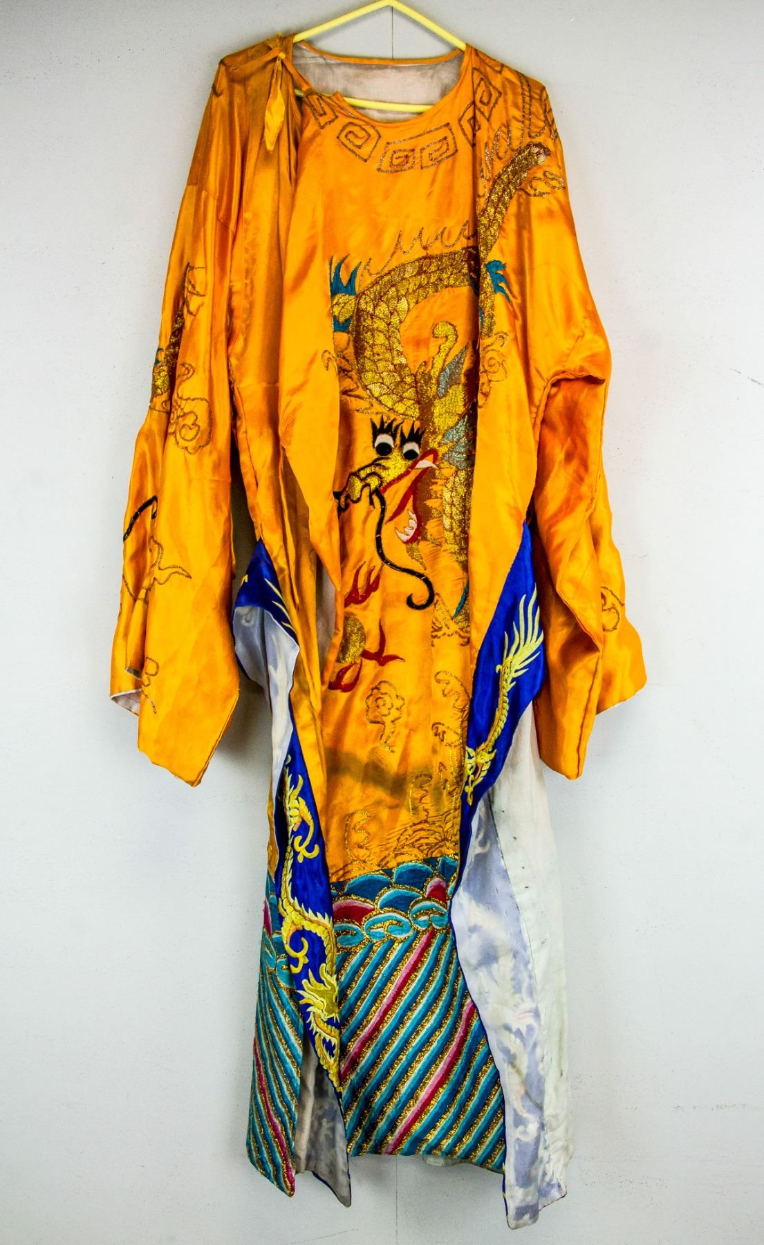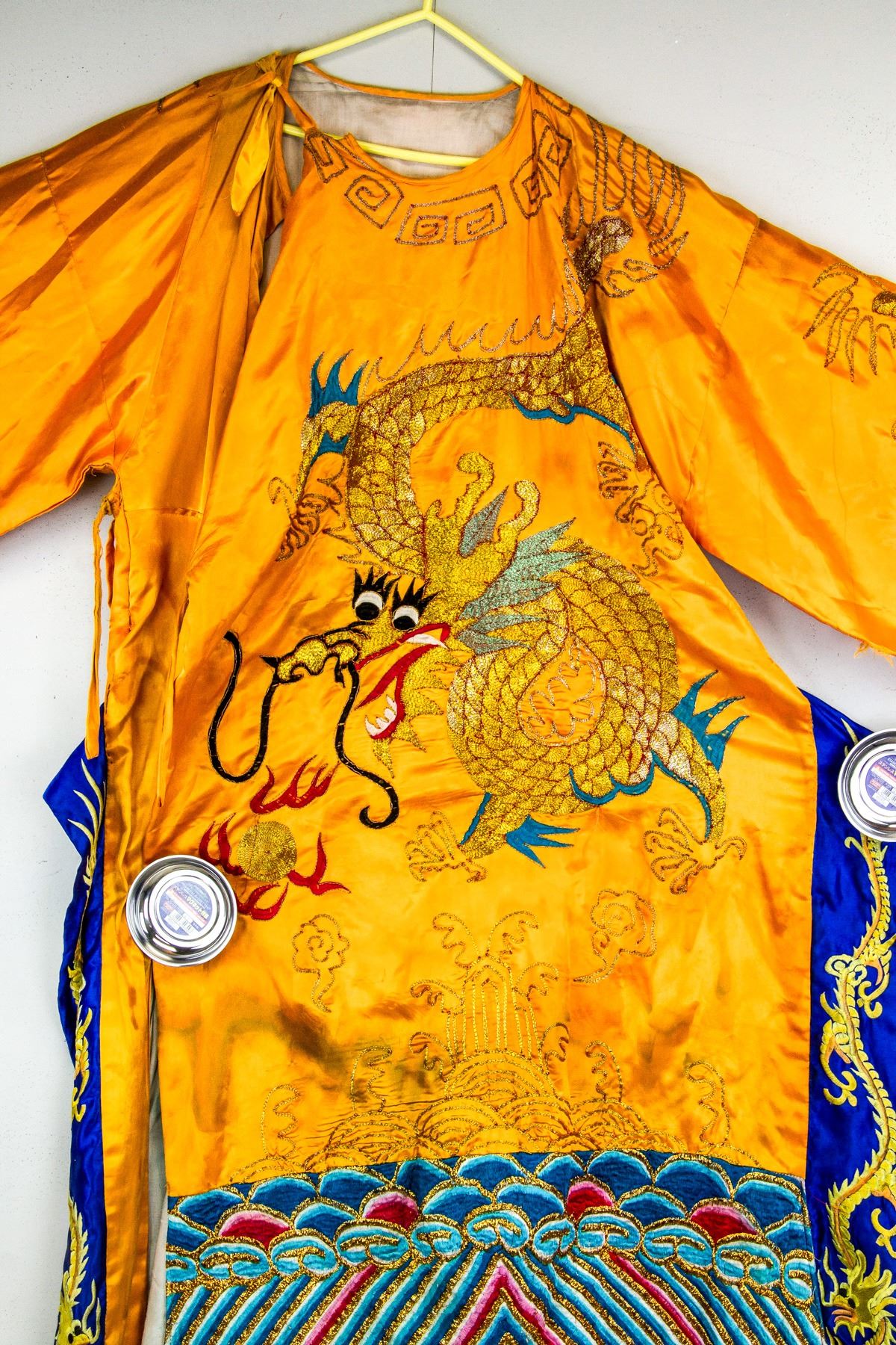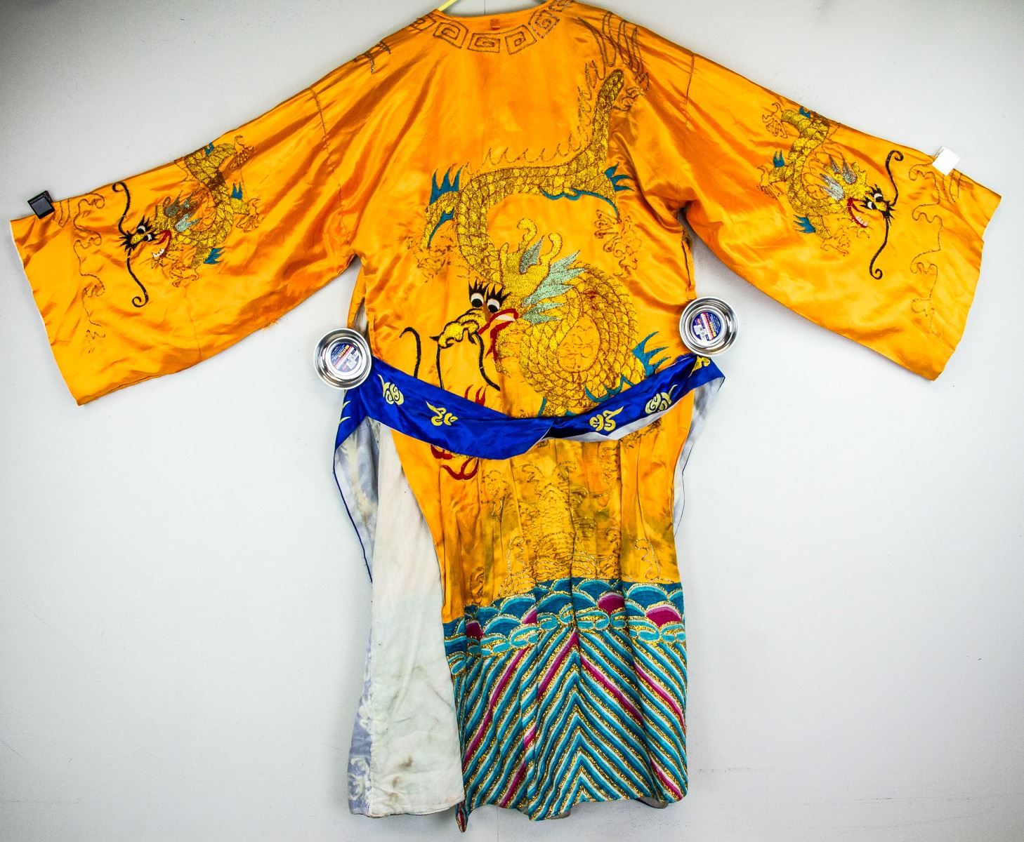 Chinese imperial type dragon robe; of yellow colour; with dragon pattern on body and sleeves; with blue waist band; geometric pattern on robe drape; H: 159 cm, W of sleeves: 60 cm, Waist: 66 cm