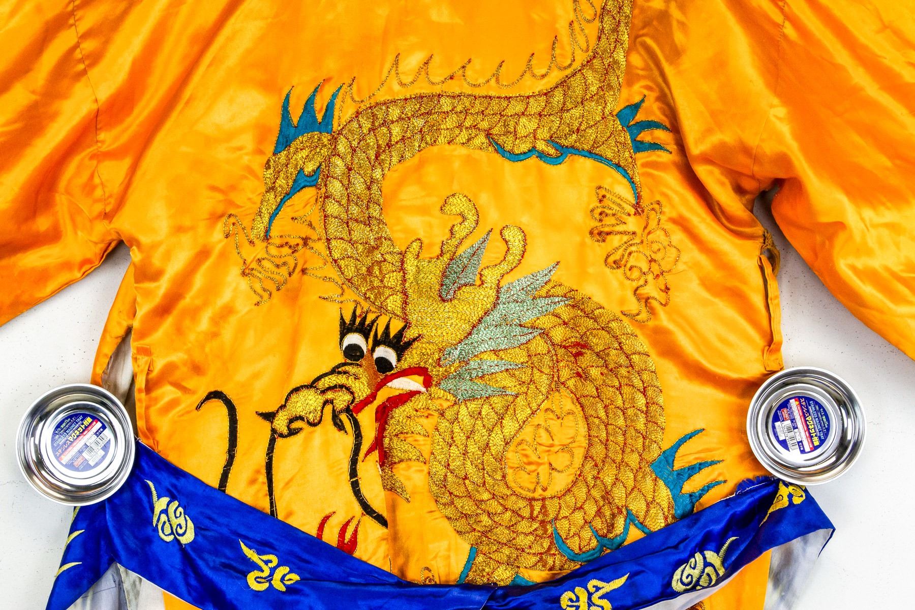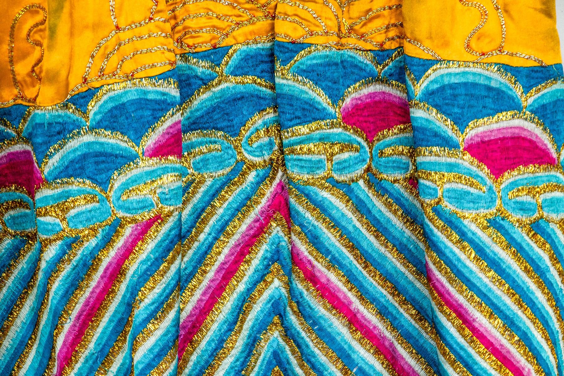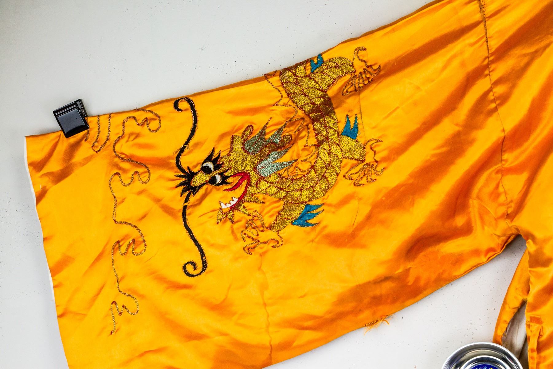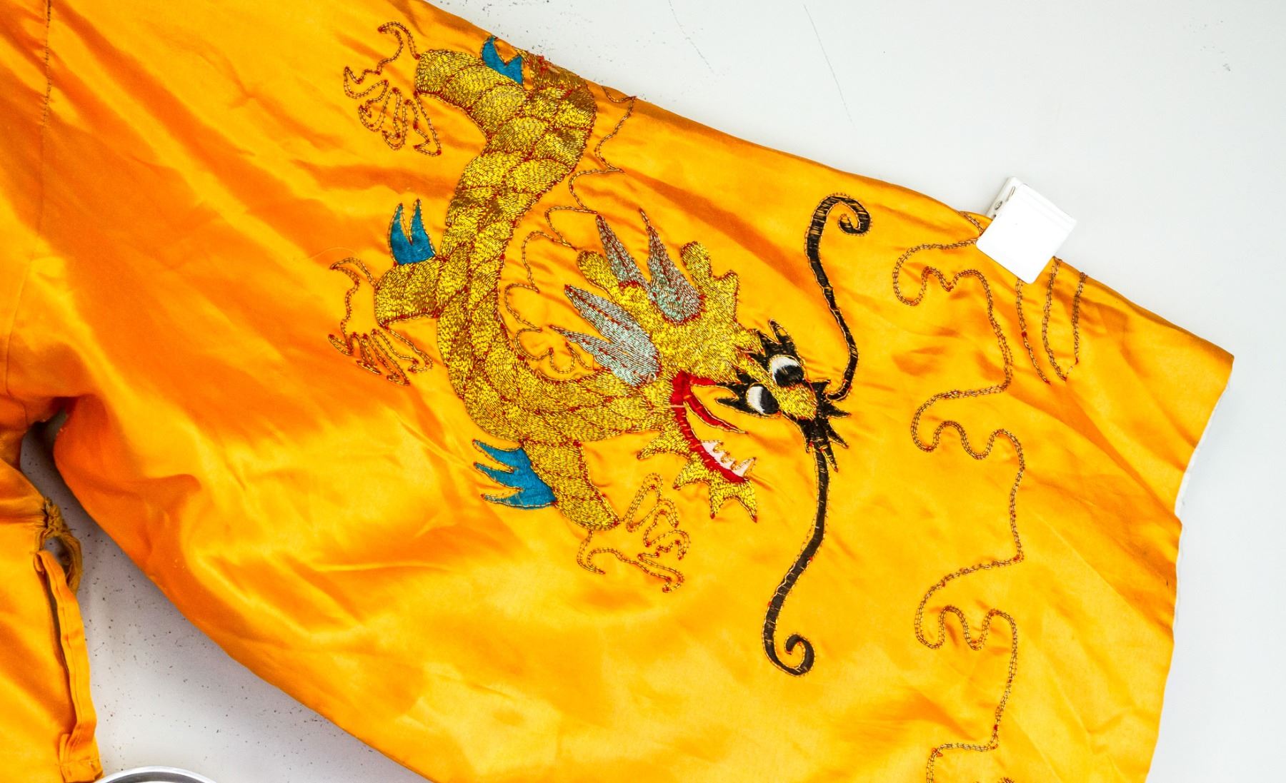 Chinese imperial type dragon robe; of yellow colour; with dragon pattern on body and sleeves; with blue waist band; geometric pattern on robe drape; H: 159 cm, W of sleeves: 60 cm, Waist: 66 cm