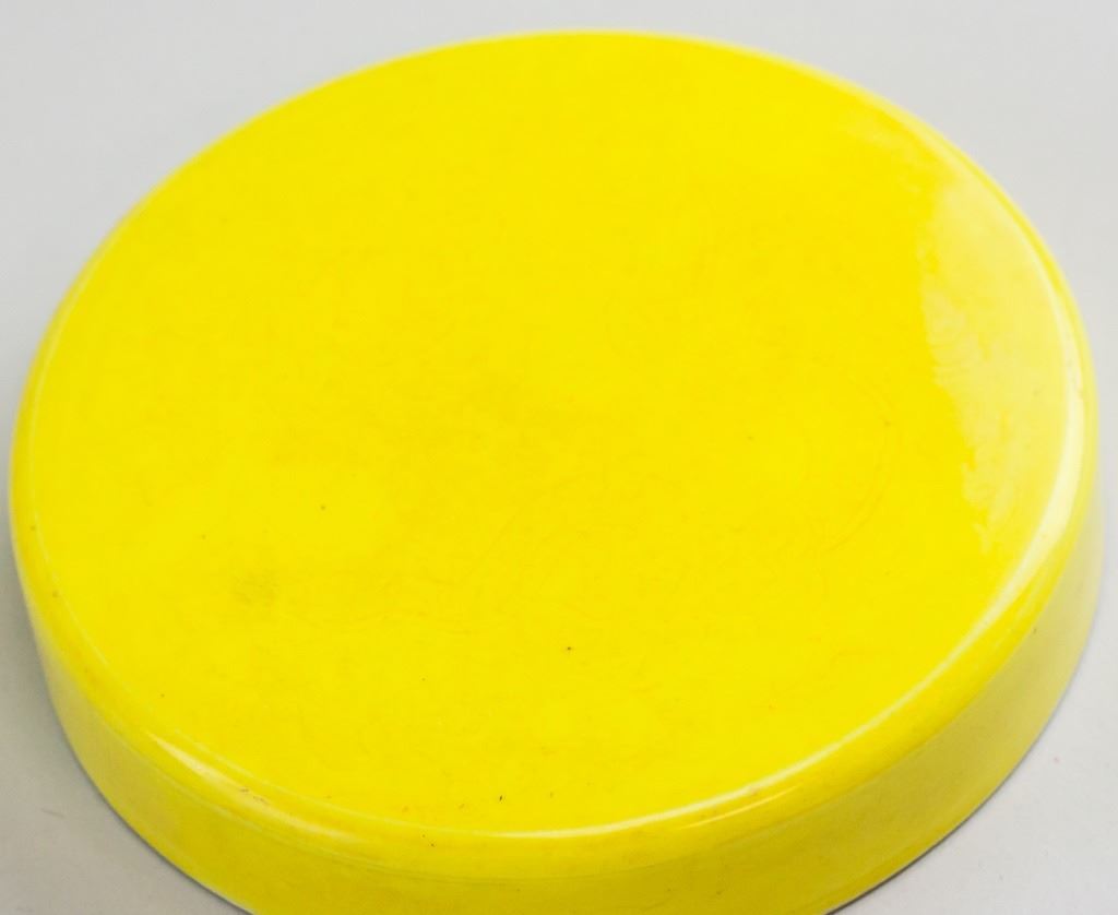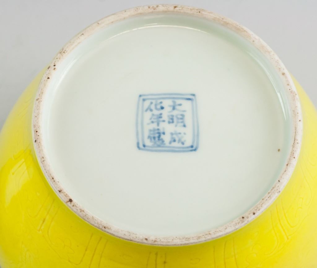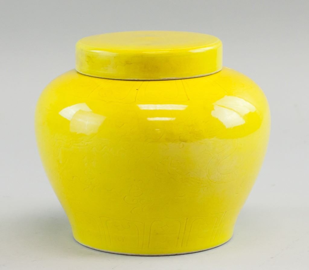Chinese imperial style yellow porcelain jar. Of round body with lid. Six-character Ming dynasty Chenghua mark on base. 17 x 16 cm, 690 grams