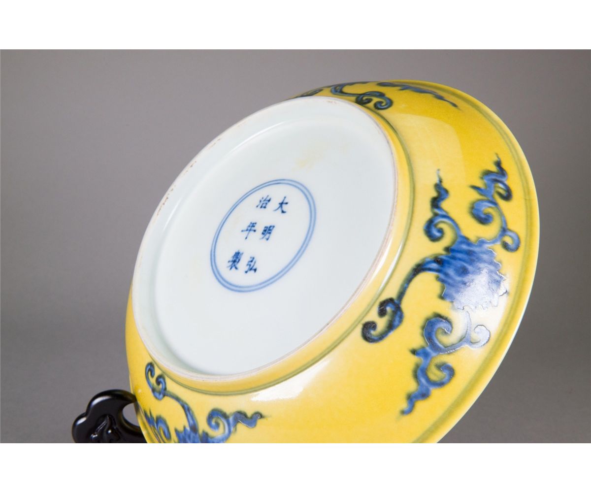 Chinese imperial yellow ground porcelain charger; featuring blue orchid on yellow ground; six-character Ming Hongzhi mark on base; H: 6 cm, D: 27 cm, 742 grams