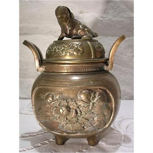 Chinese Incense carry made in bronze. With some fixed parts. In the ocver has the dog, cracteristic from chinese. Has beautiful relief, remarking eagles. From end of 19th Century. One of the dog's feet is broken.