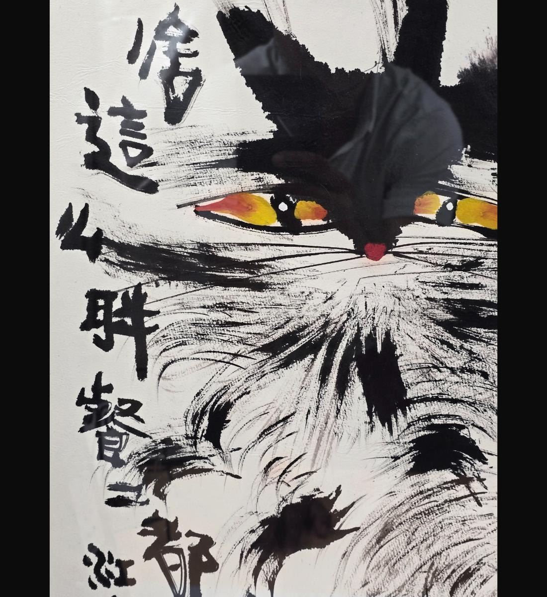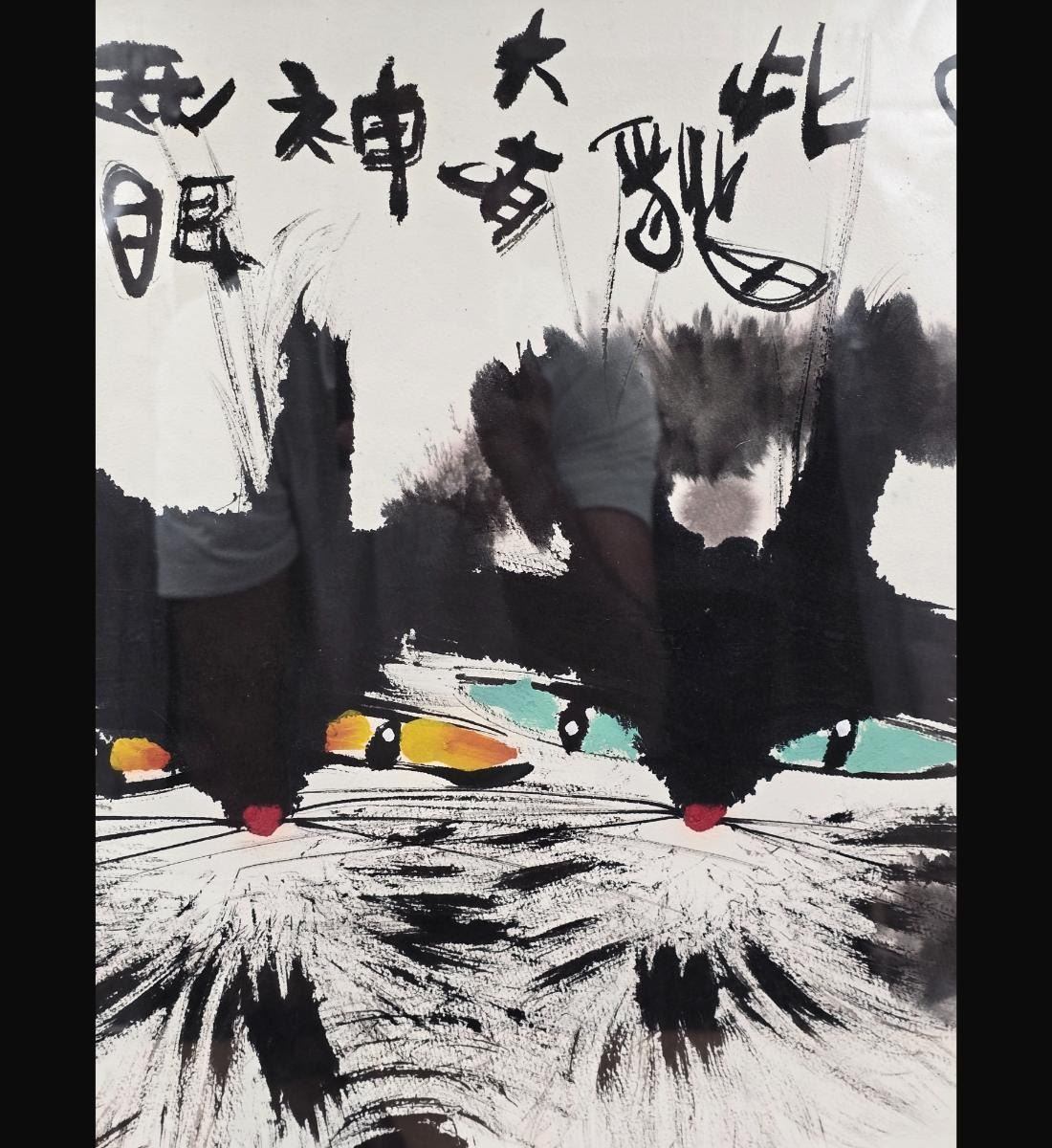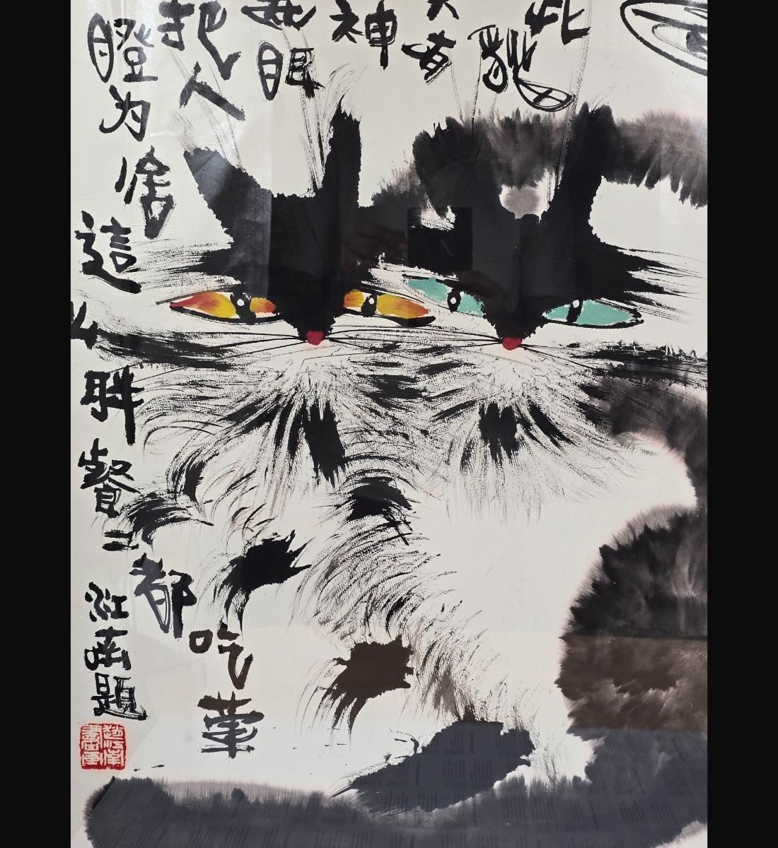 Chinese Ink And Watercolor Painting Two Cats With Calligraphy & Seal Mark. Framed Measure 28.5" X 27.5". Provenance: One Person Private Estate Central Florida.