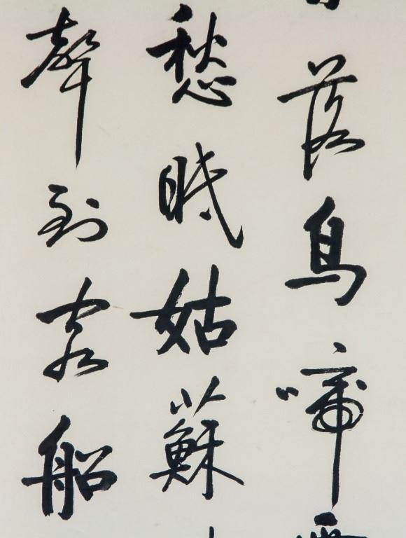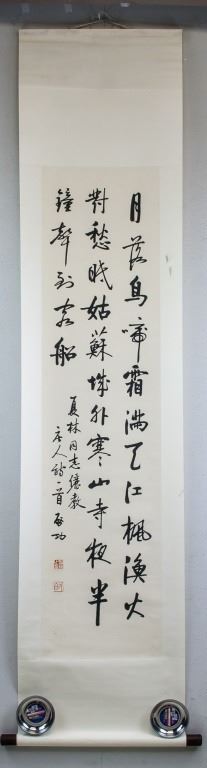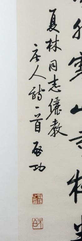 Ink on paper, hanging scroll, featuring Chinese calligraphy in semi-cursive script, signed Qi Gong, inscribed with 2 artist seals, 137 x 33.5 cm.