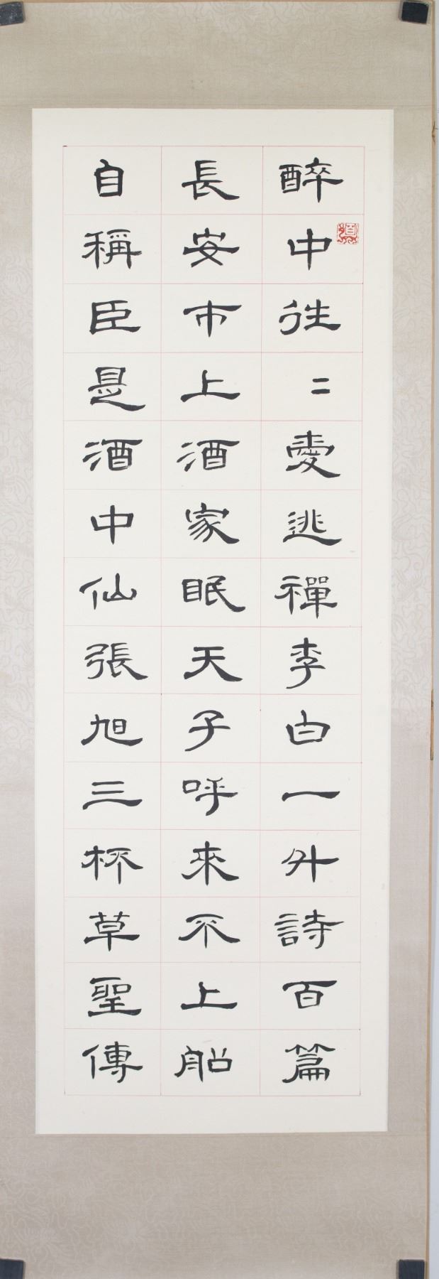 Ink on paper roll. Featuring Chinese calligraphy in clerical script. Inscribed with one artist seal. 97 x 35 cm
