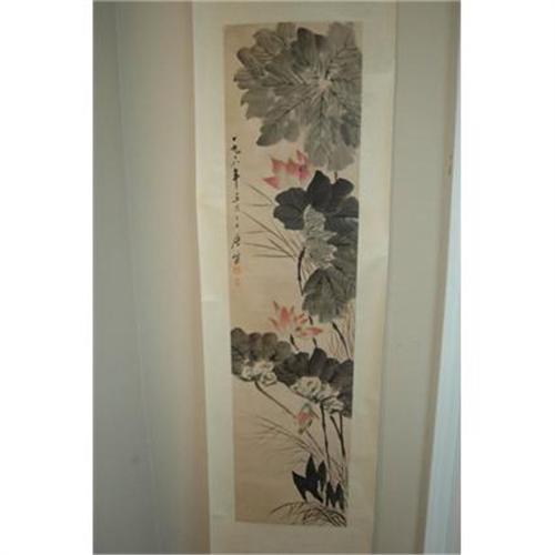 Attributed to Tang Yun ( Chinese 1910-1993 ). Decorate with birds and floral. Good condition. 52" x 13" painting itself.