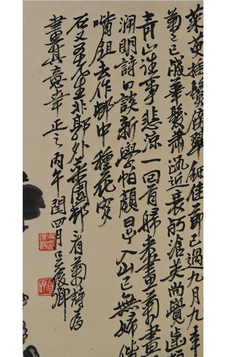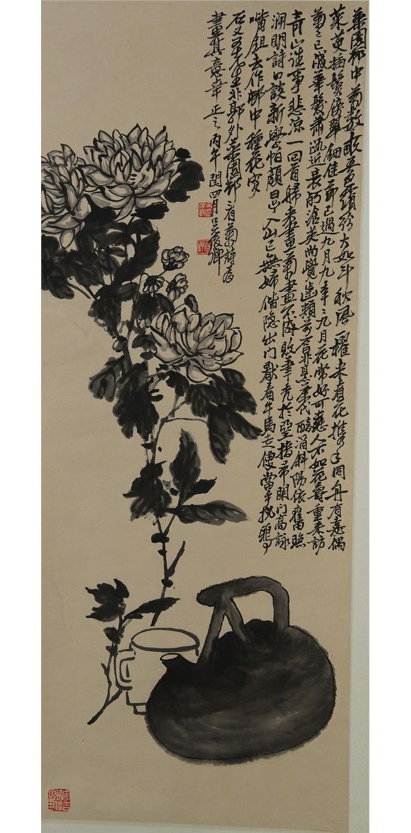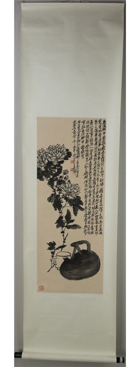 Chrysanthemum and tea set, hanging scroll, Chinese ink on paper, signed Wu Chang Shao with three red seals; 96 cm x 37 cm; Provenance: T. Ng Collection Toronto