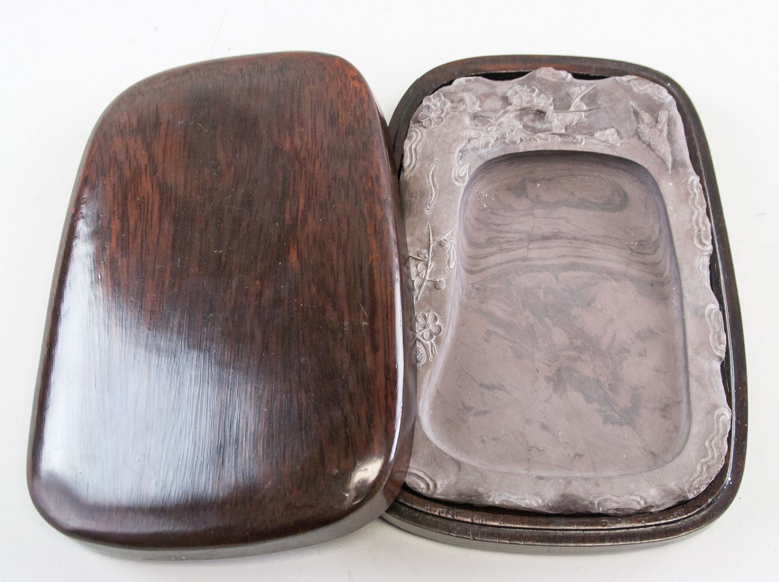 Chinese ink stone with wooden box. Box of smooth and polished wood. 4 x 20 cm, 270 grams (2).