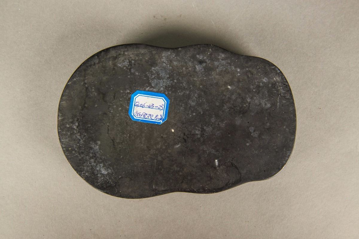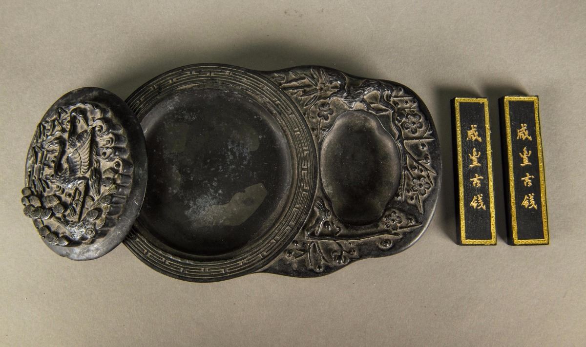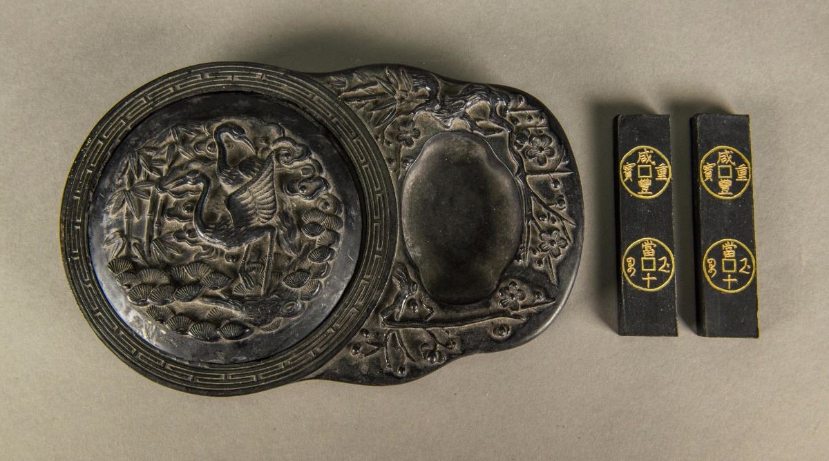 Chinese ink stone with cover and two ink sticks; featuring carvings of cranes and trees on ink stone; L: 22 cm, W: 14 cm, 1276 grams