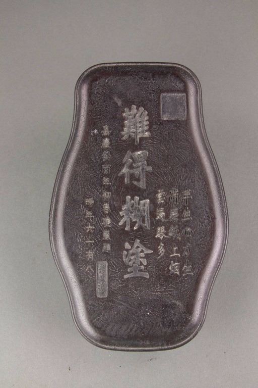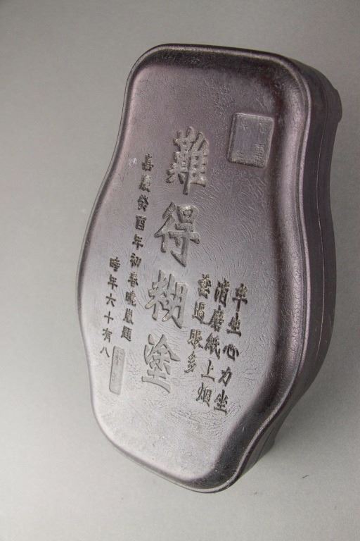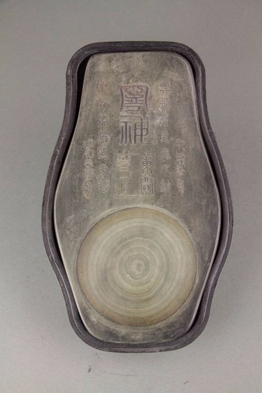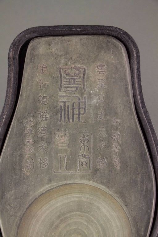 Chinese ink stone; carved with Chinese calligraphy "Yun Fei Yue Zou Tian Bu Dong, Lang Da Chuan Yao Dao Wei Yi", and marks of Xue Shen; signed Qian Qianyi (1582-1664); accompanied with a wood case; carved Chinese calligraphy "Bi Sheng Xin Li Zuo Xiao Mo, Zhi Shang Yan Yun Guo Yan Duo", "Nan De Hu Tu" and signed Ji Xiaolan (1724-1805); H: 24 cm, W: 13 cm, 2667 grams