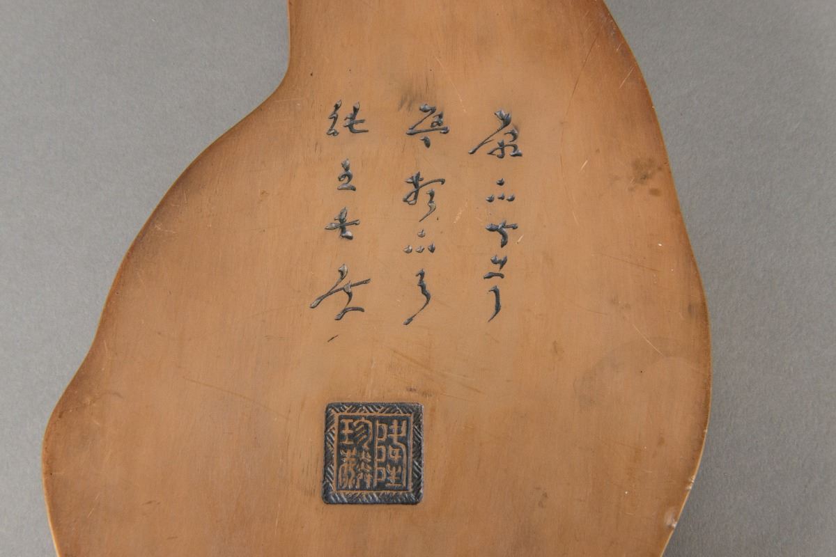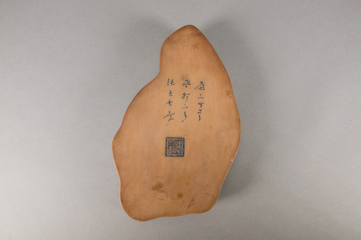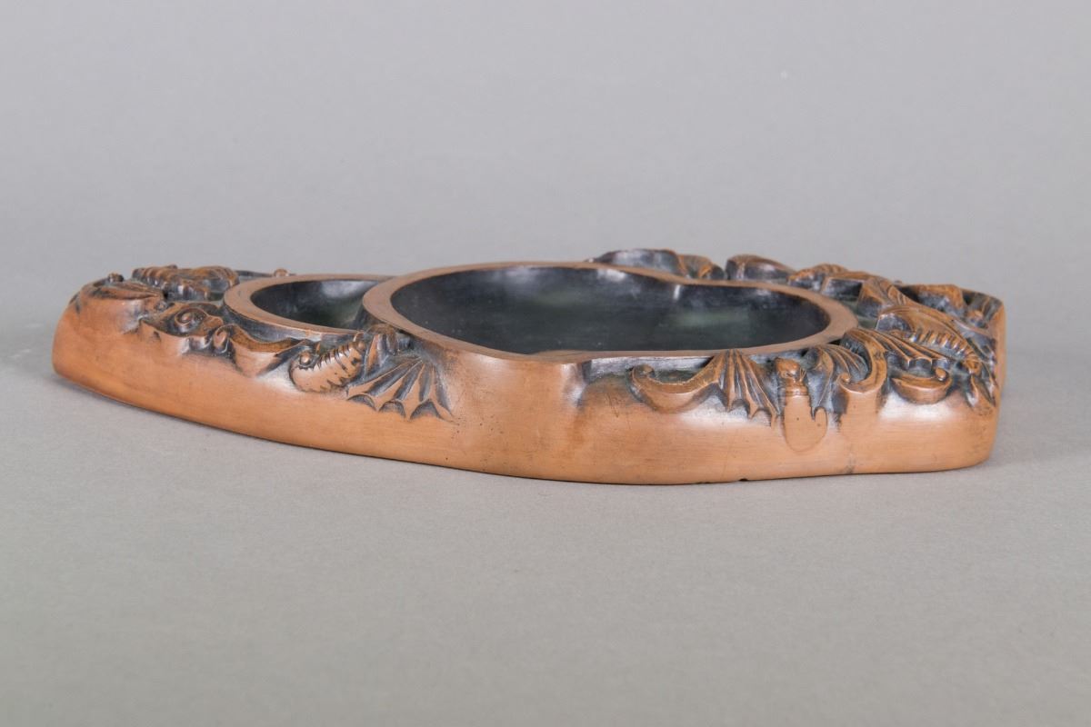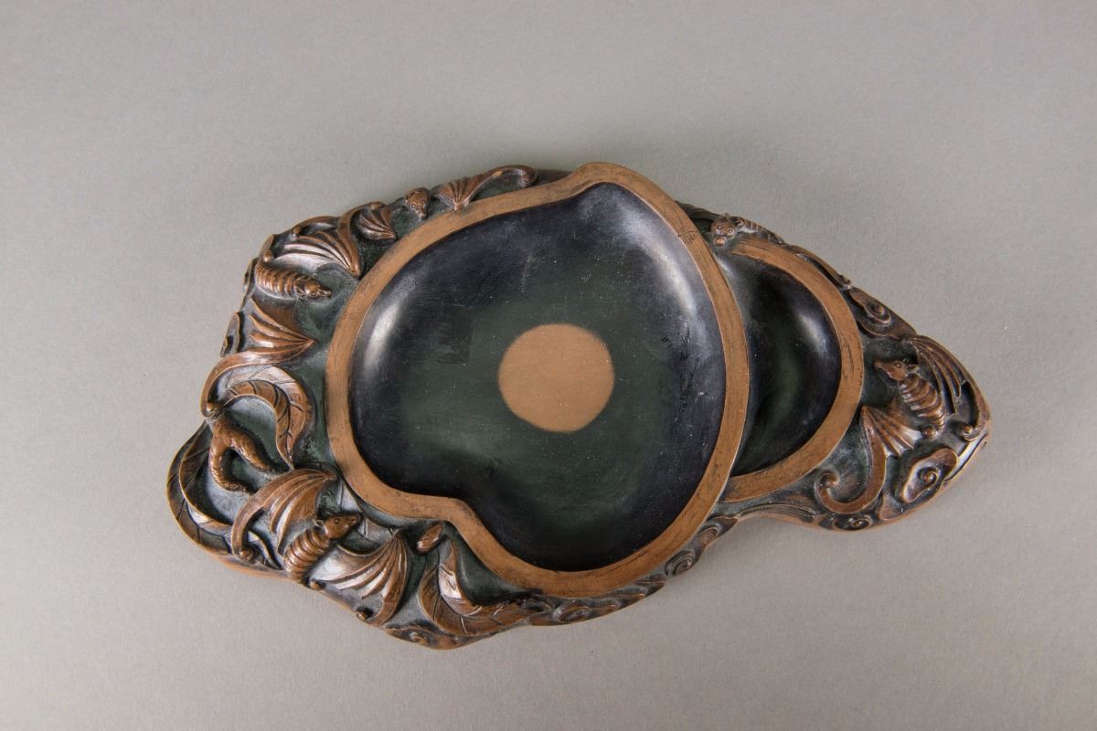 Chinese ink stone; featuring shape of peach surrounded by bats; with unidentified script calligraphy and artist seal on base; H: 3 cm, W: 30 cm, 1349 grams