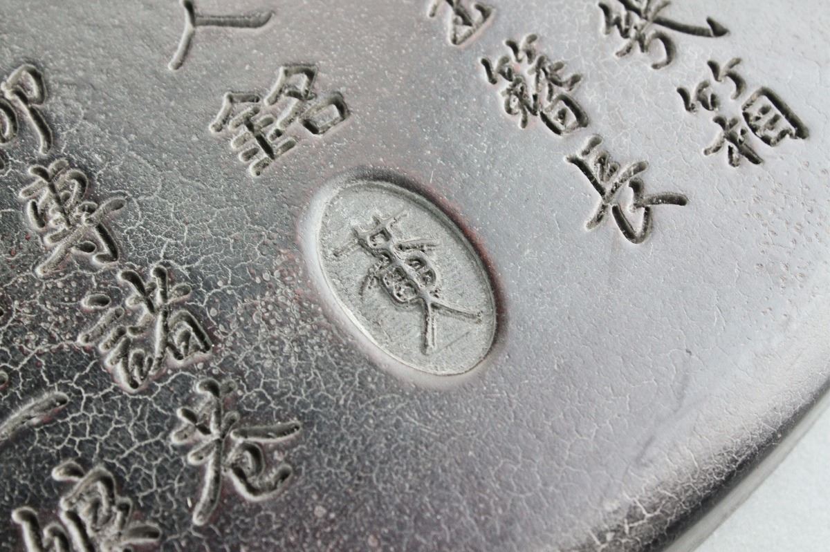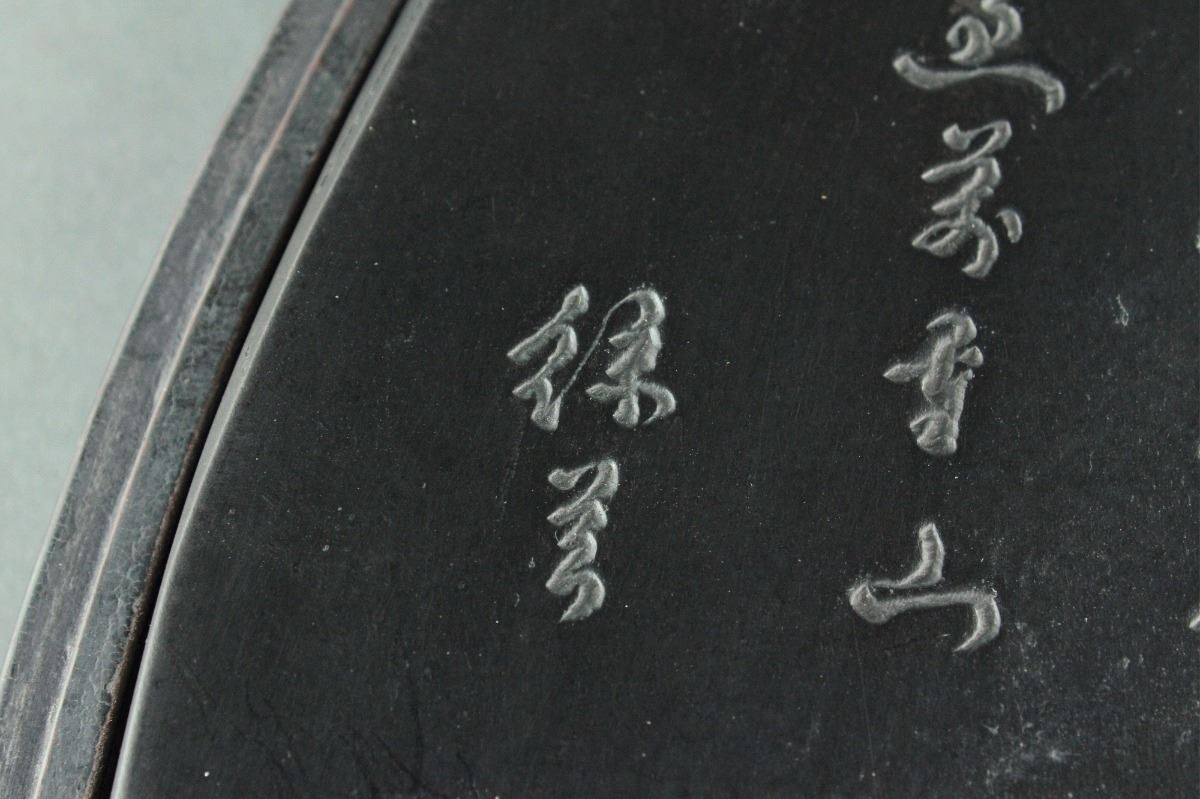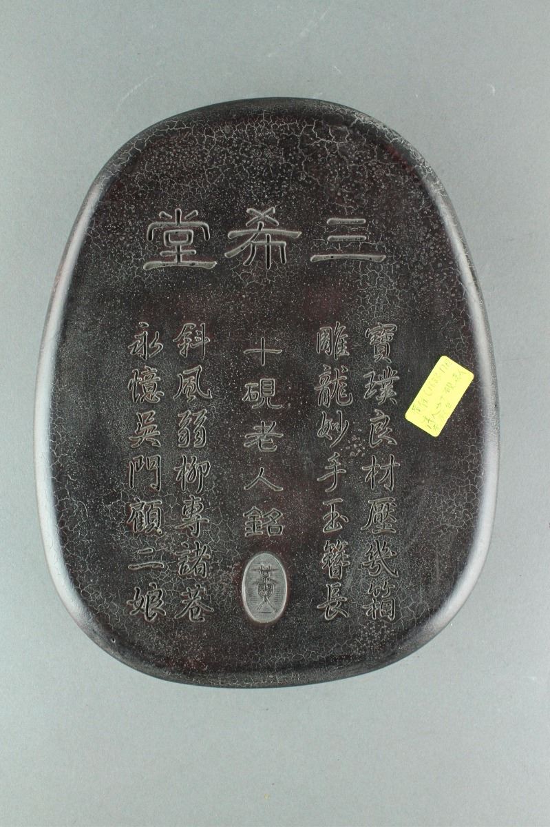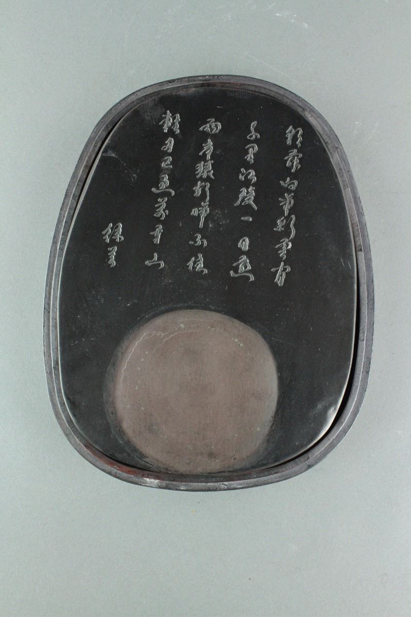 Chinese ink stone with wood box; of oval form; carved script calligraphy and artist signature on stone; Sanxi Tang mark on cover; H: 25.5 cm, W: 20 cm, 3385 grams