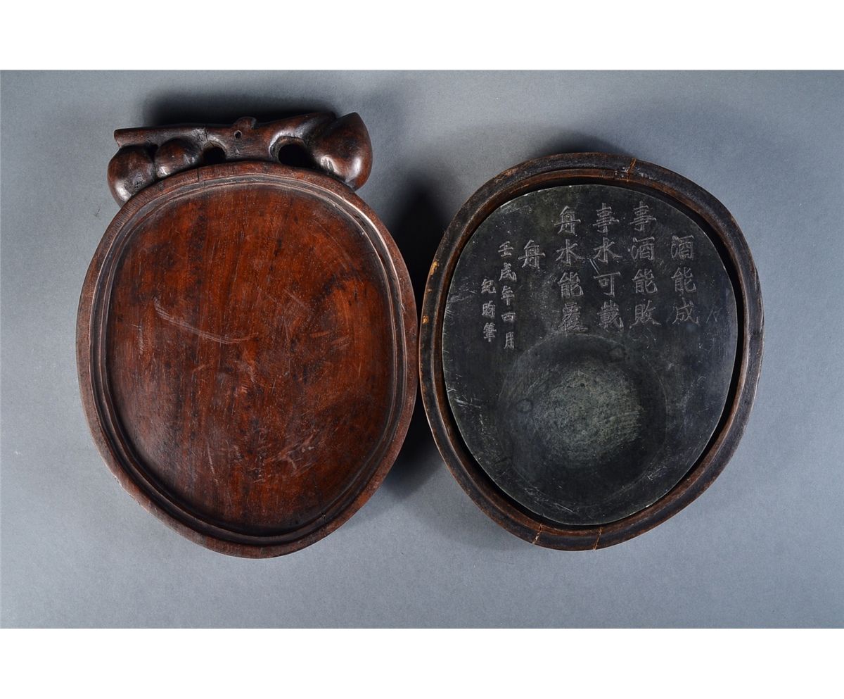 Chinese carved ink stone with calligraphy enclosed within wood carved case; L: 12 cm, W: 15 cm, Thickness: 6 cm, 1731 grams