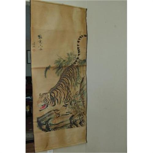 </font></strong>Chinese Ink on paper Scroll Painting. Decorate with tiger figure. some age wear. 46" x 26" painting itself.</font>