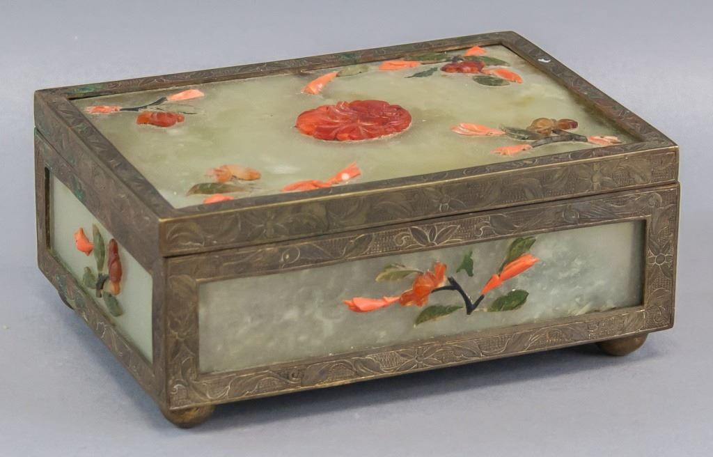 Chinese jade jewelry box. With inlaid flowers. "CHINA" stamped on base. 5 x 13.5 x 10 cm, 646g.