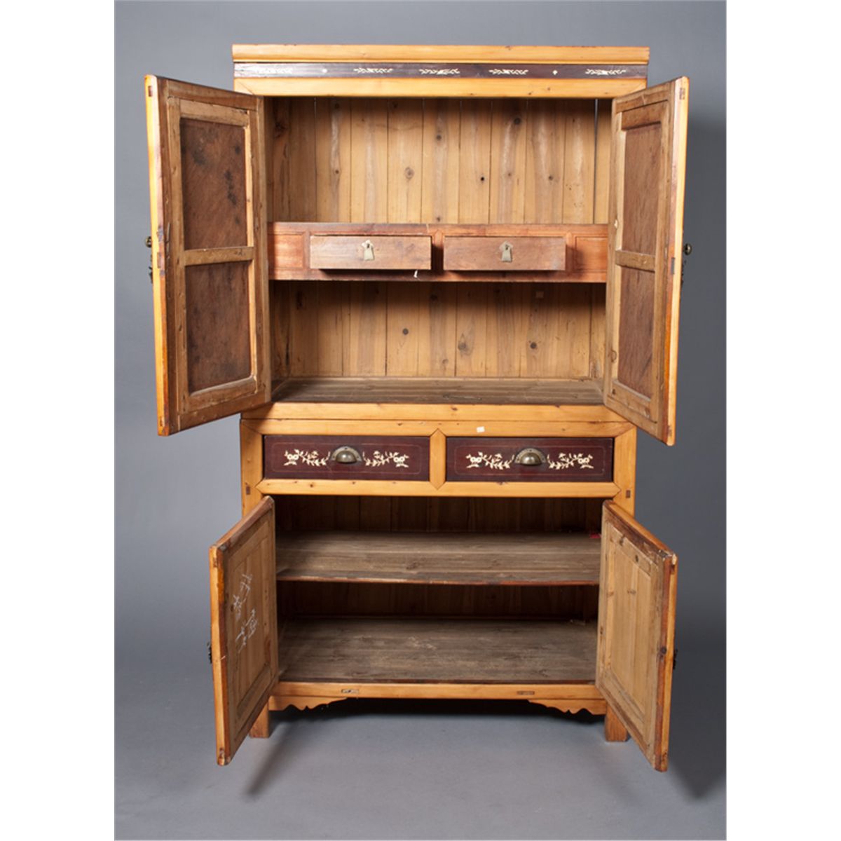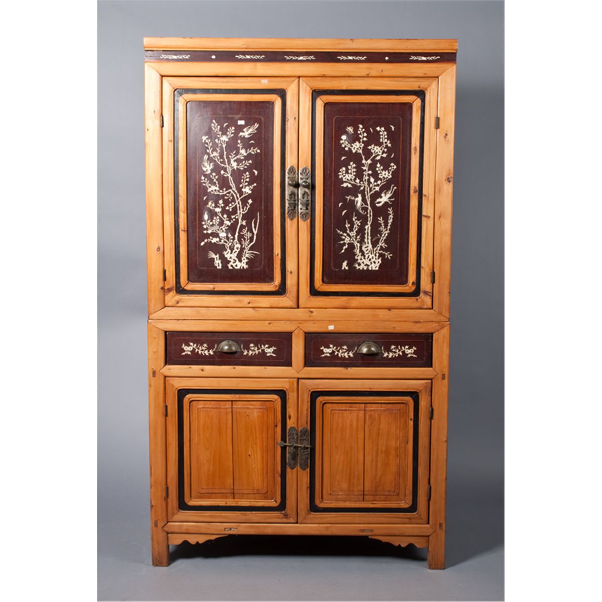 Finley inlaid with bone or ivory to depict birds, butterflies within trees, with two doors, over two drawers, over two doors, all very well done, 72.5"H x 41"W x 22"D, circa early 20th century. Private collection Holly, MI.