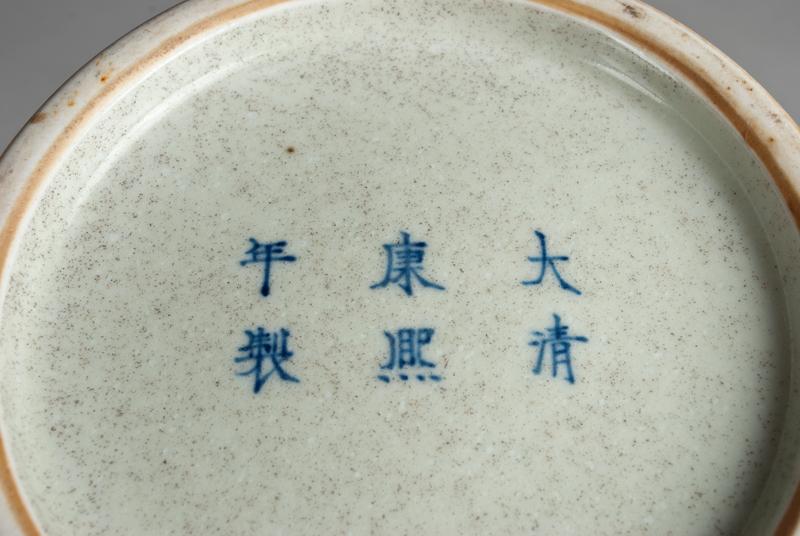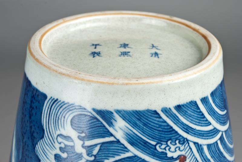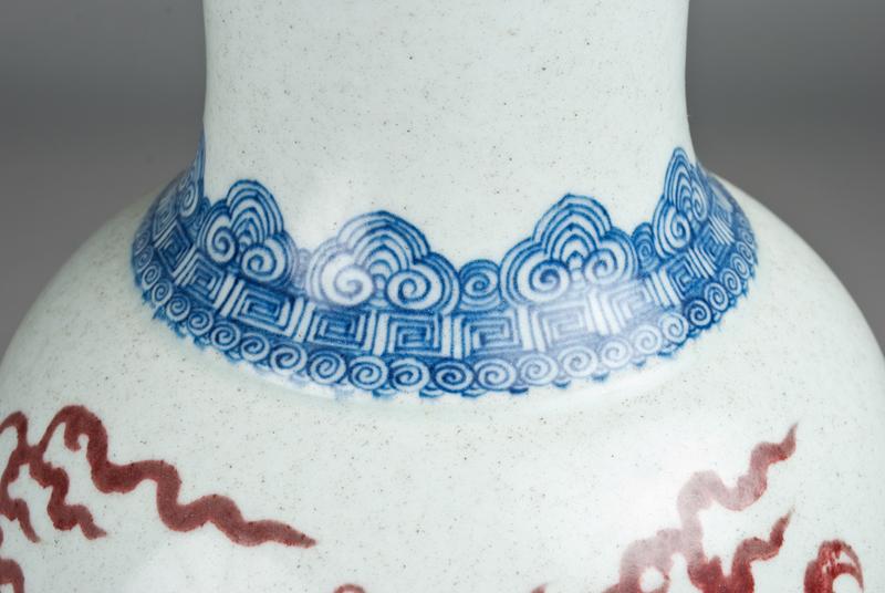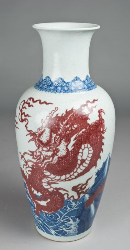 Depicting a five clawed dragon on both sides chasing a flaming pearl in iron red, amid clouds in blue and Greek key design in blue at shoulder. 17.75" H x 8.5" W. Six character mark in underglaze blue on underside.