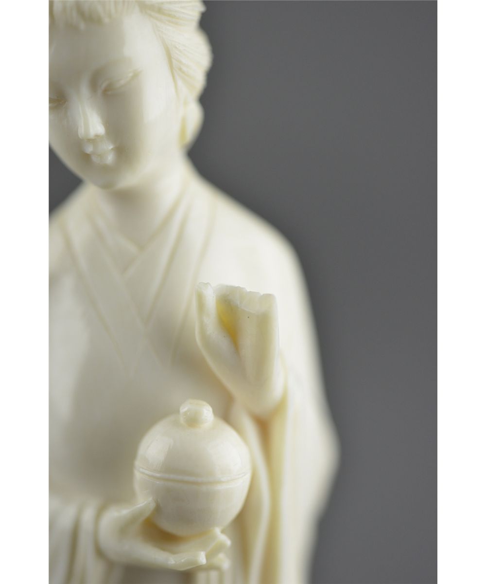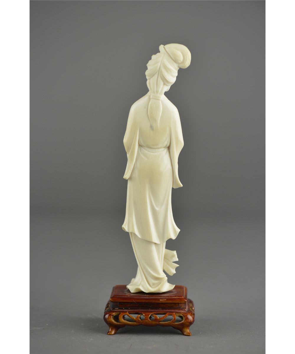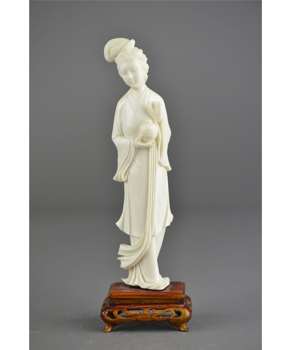 Chinese ivory carved figure; featuring beauty holding an urn and standing atop wood base; H: 16 cm, 119 grams (including wood base)