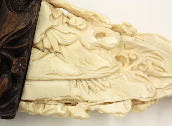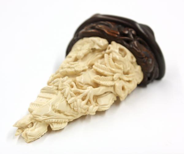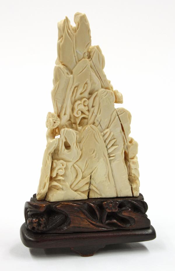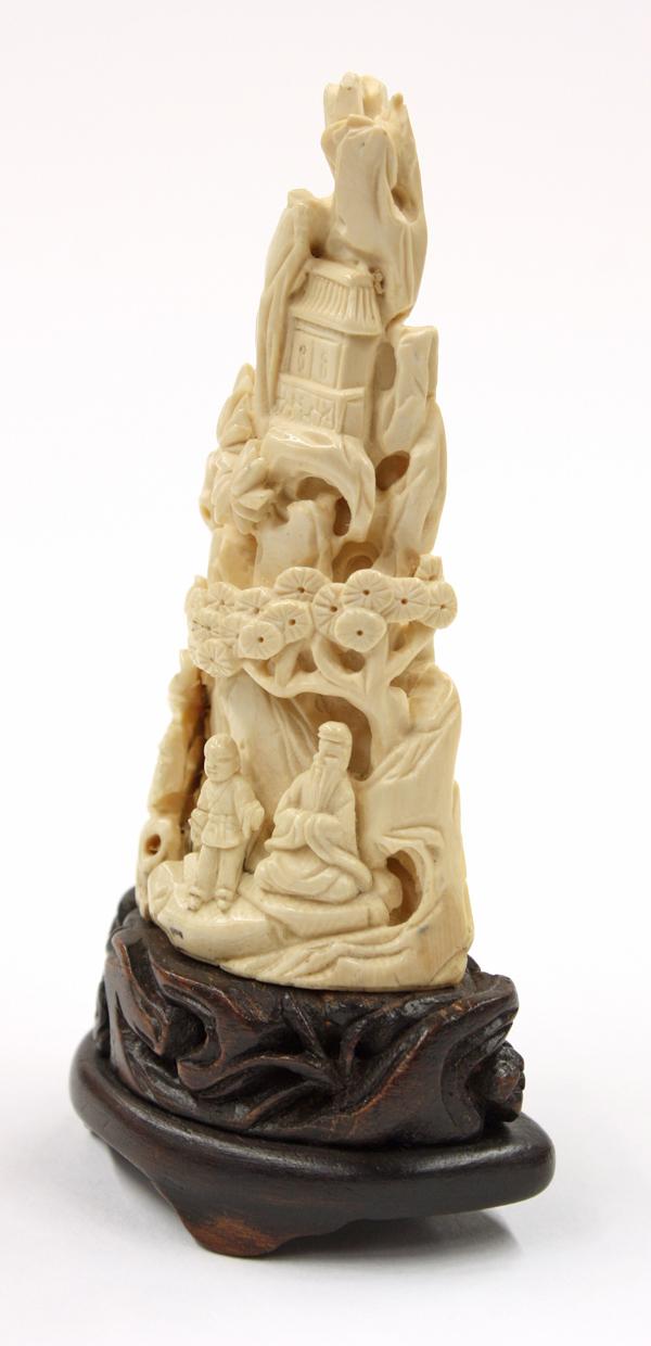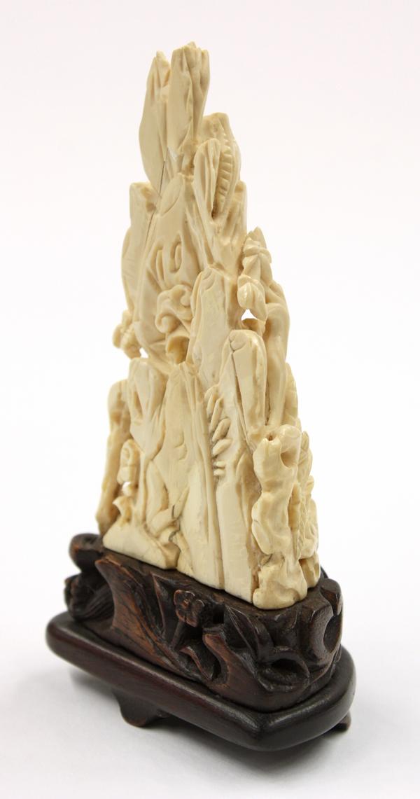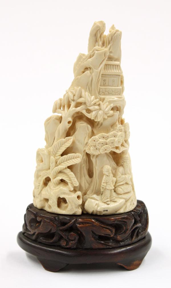 Chinese ivory desk ornament, carved and undercut with a sage accompanied by an attendant in a miniature landscape with pine, palm and other types of trees silhouetted against jagged cliffs with a temple featured near the mountain top, 3.5''h; attached to a wooden stand, overall 4.5''h