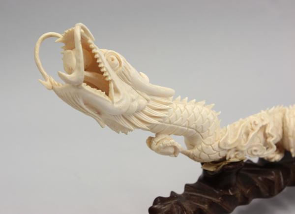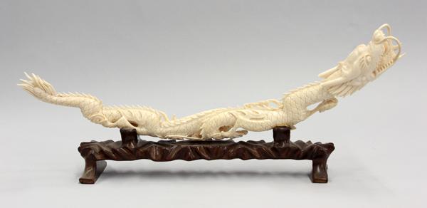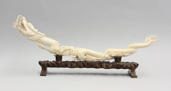 Chinese ivory carving of a dragon, shaped with a long scaly body writhing through scrolling clouds, the prominent head shaped with an opened mouth revealing a sacred jewel resting on its tongue (repairs and minor losses), 18.5''w; with wooden stand