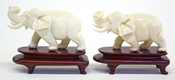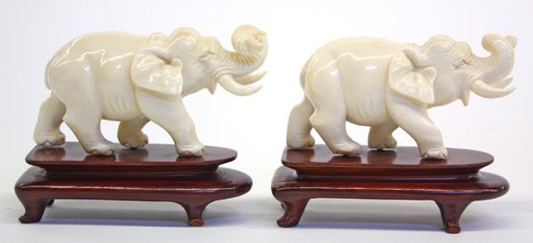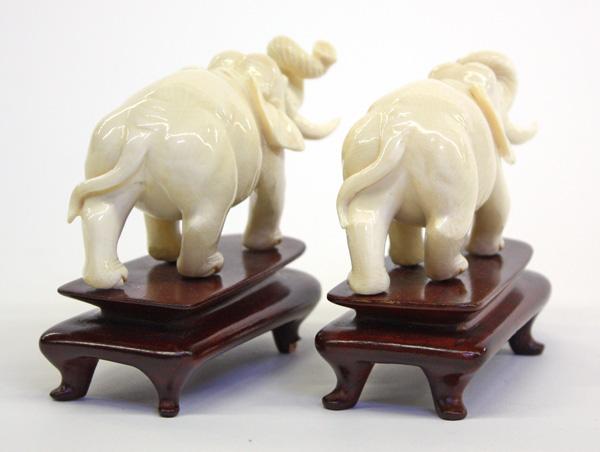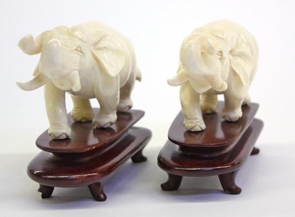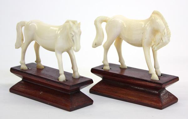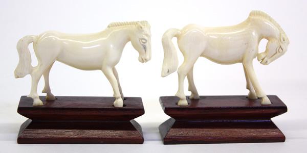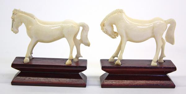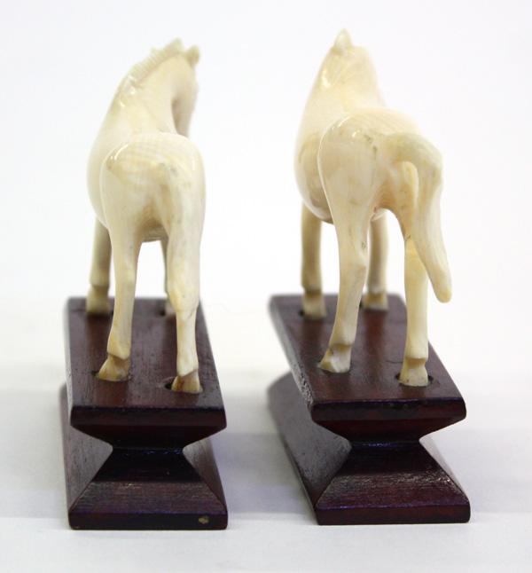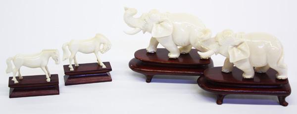 (lot of 4) Chinese ivory animal carvings, the first a pair of elephants walking with trunks curling upwards, with wood stands, 4.5''l; the second a pair of miniature horses, wood stands, 2.75''l
